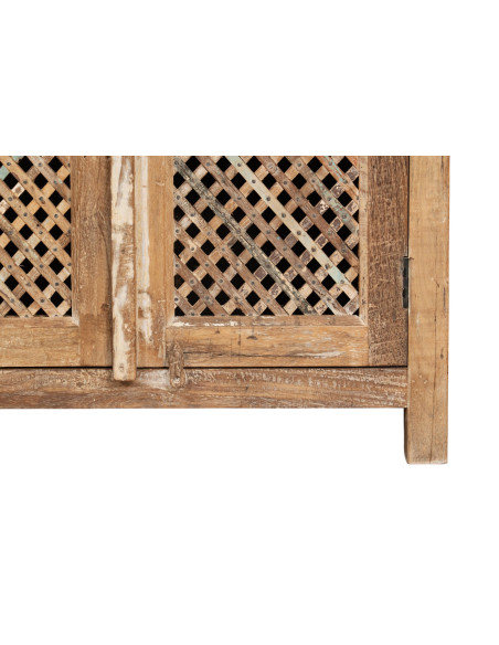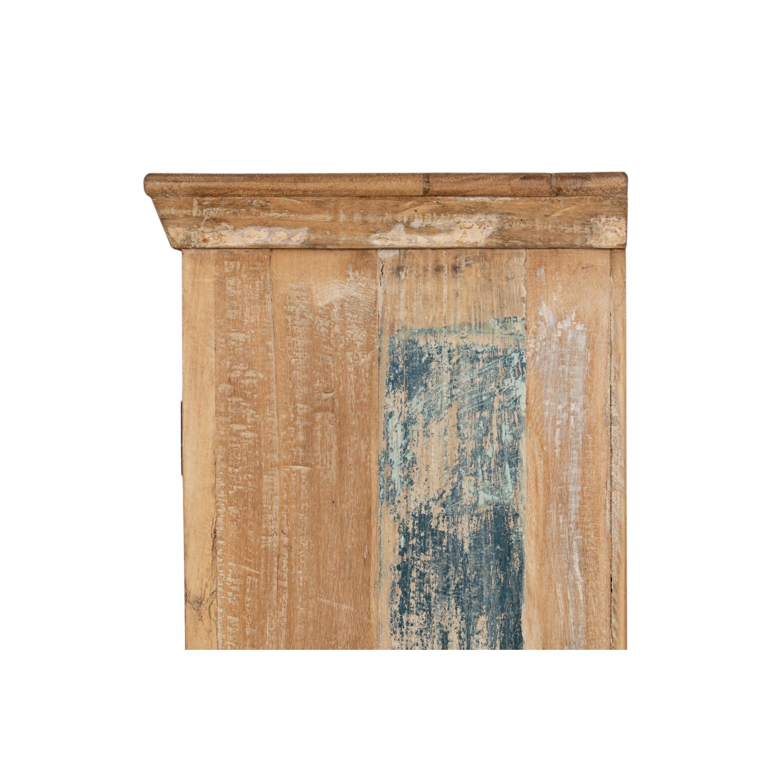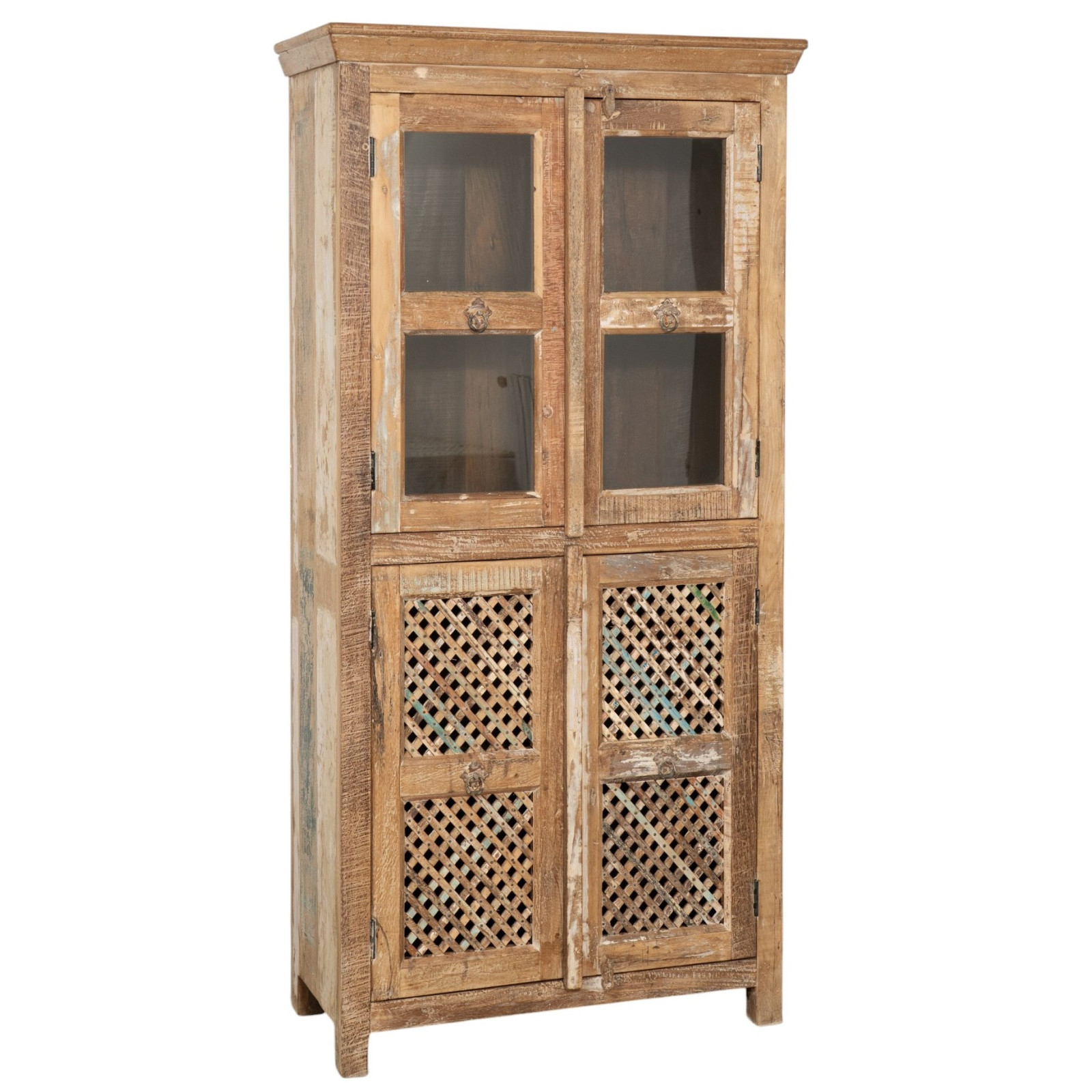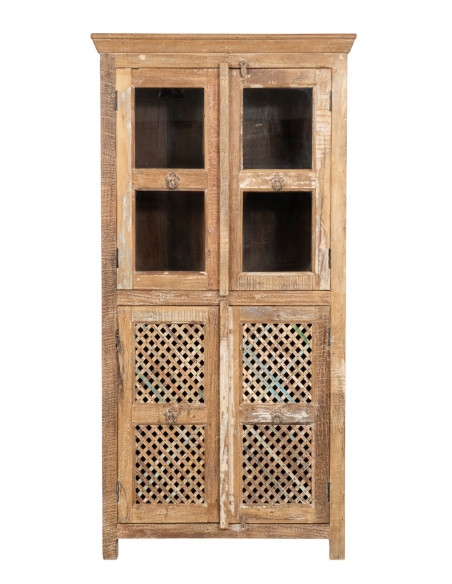 Kierrätetty massiivipuusta valmistettu vitriini, jossa on antiikkinen viimeistely