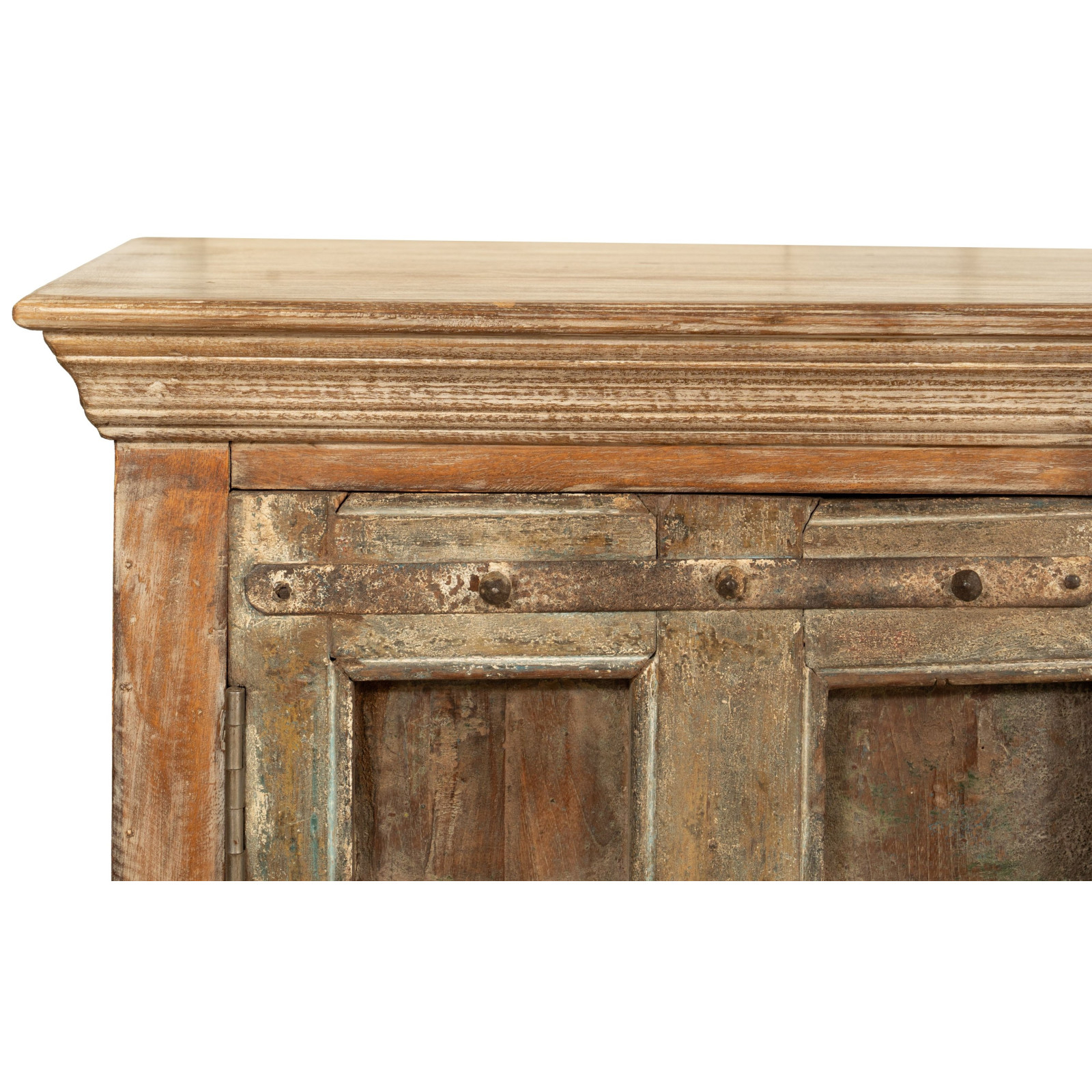 Vankka ja monipuolinen senkki, valmistettu kierrätetystä massiivipuusta. Käsin maalattu luonnollisilla maaleilla, monipuoliset sävyt tekevät jokaisesta huonekalusta ainutlaatuisen. Siinä on suuret suljetut hyllyt. Mitat L224xS51xK90 cm, sopii helposti mihin tahansa tilaan. Ihanteellinen antiikkihuonekalujen ja puun ystäville.