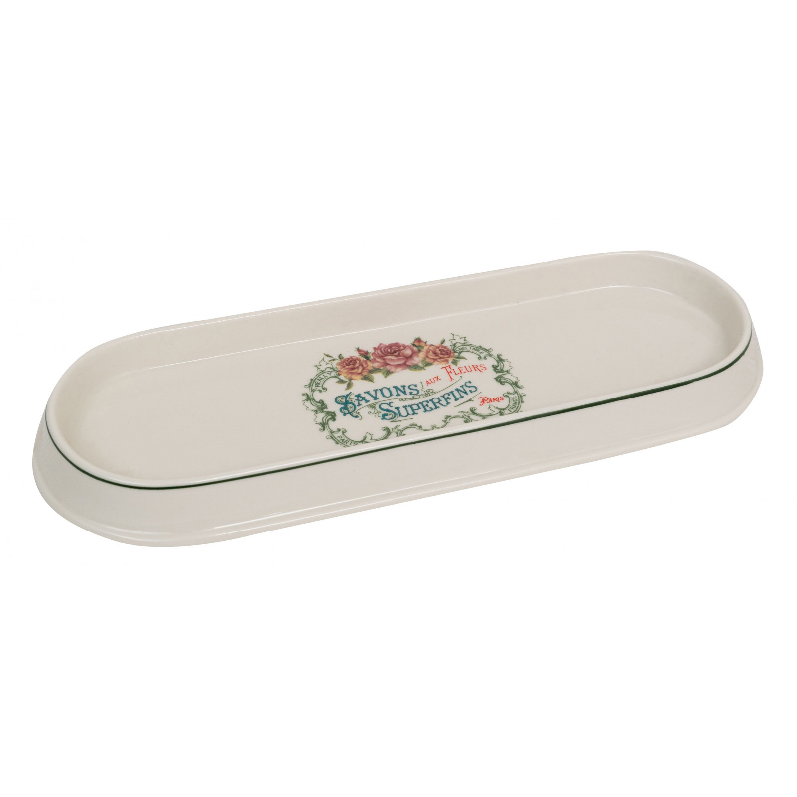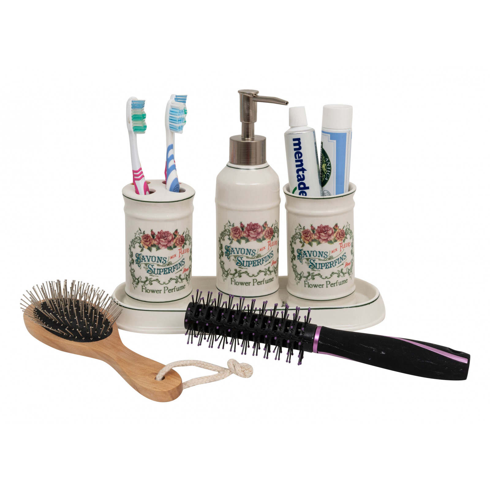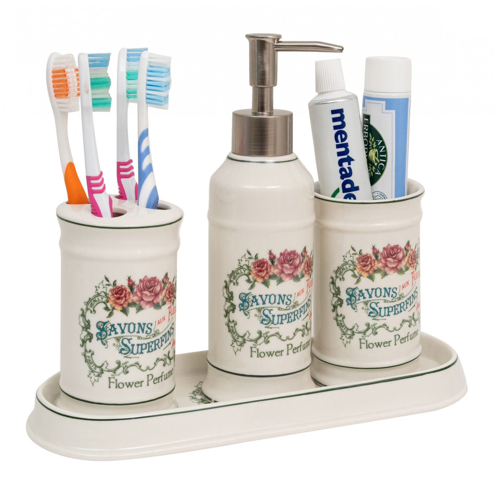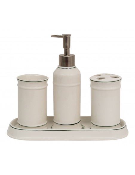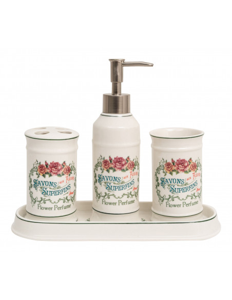 Kylpyhuonesarja on hienoa valkoista posliinia, koristeltu koostuen: monipuolisesta kohotetusta astianpesualustasta tai taskutarjottimesta (L25xPR10xH3 cm), hammasharjan pidikkeestä (L7xPR7xH11 cm), nestesaippuan annostelijasta (L7xPR7xH21 cm), monitoimisylinterimäisestä astiasta (L7xPR7xH11 cm).