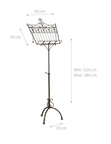 Käytännöllinen ja erittäin vakaa lattialla seisova pulpetti L46xPR32xH139 cm, joka on valmistettu massiivisesta takoraudasta. Korkeutta voidaan säätää vähintään 120 cm:stä enintään 165 cm:iin (mitat viittaavat artikkelin enimmäiskokoon), ja se on monipuolinen ja tyylikäs huonekalu. Sopii hyvin myös ruokalistapidikkeeksi ravintoloihin.