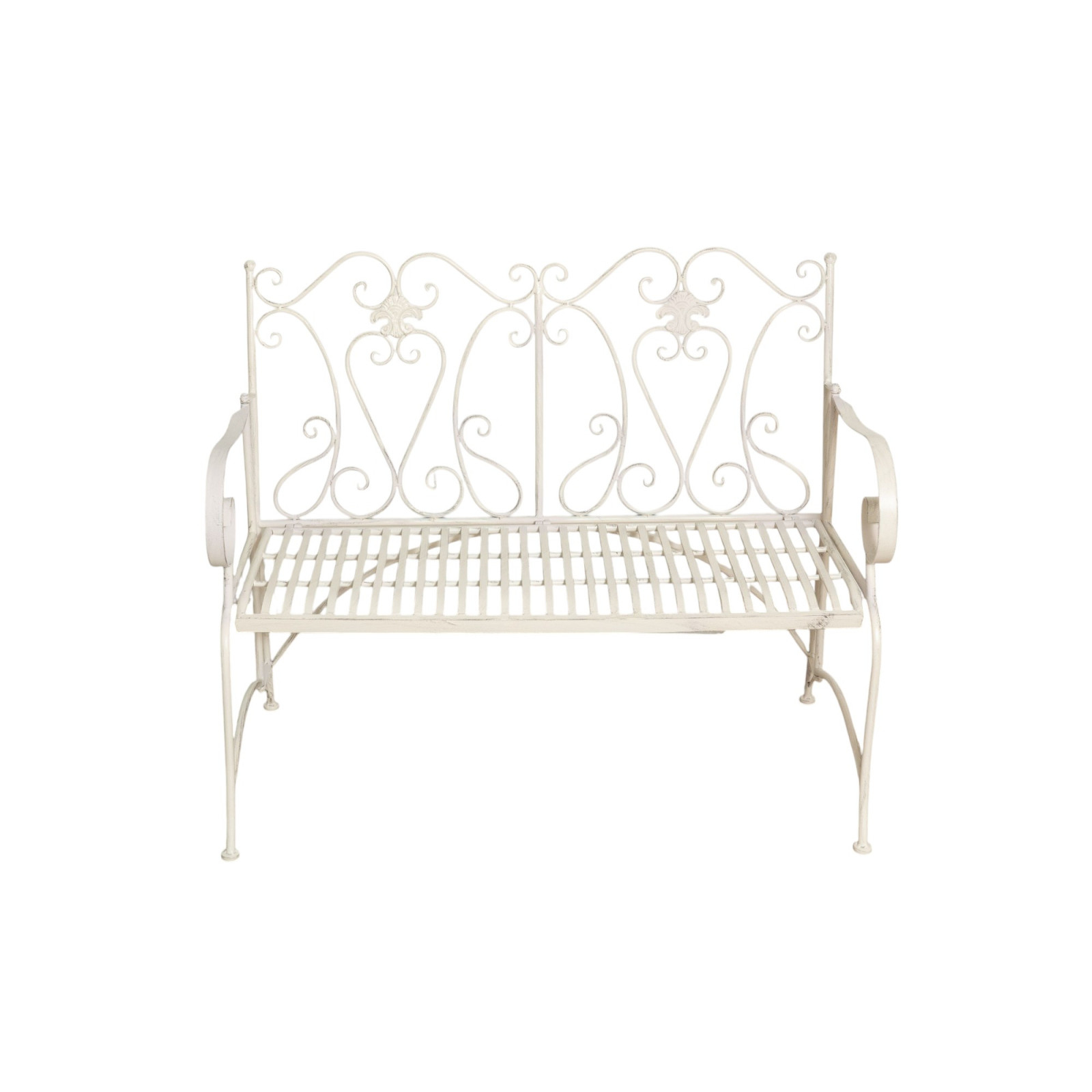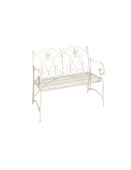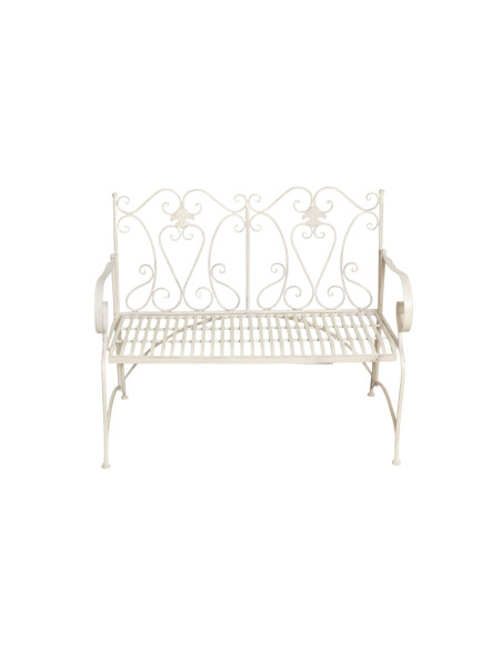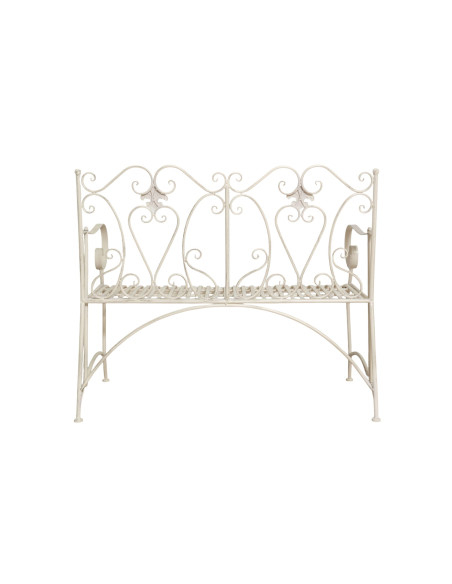 Rautaiset penkit, leveys 113 cm, syvyys 58 cm, korkeus 94 cm, antiikkivalkoinen viimeistely. Provencal-tyylisellä muotoilullaan se sisustaa toimivalla eleganssilla minkä tahansa tilan, sekä sisä- että ulkotiloissa.