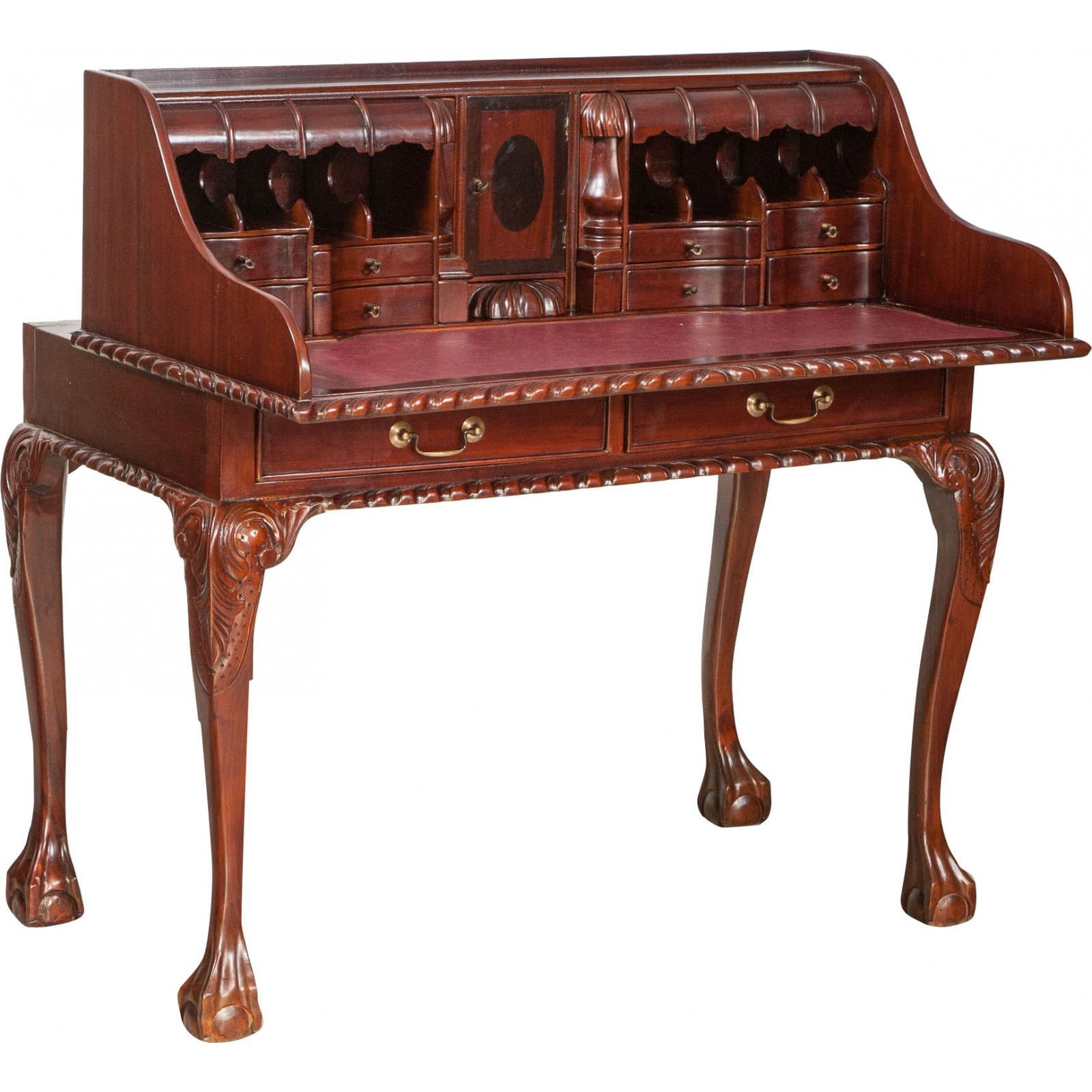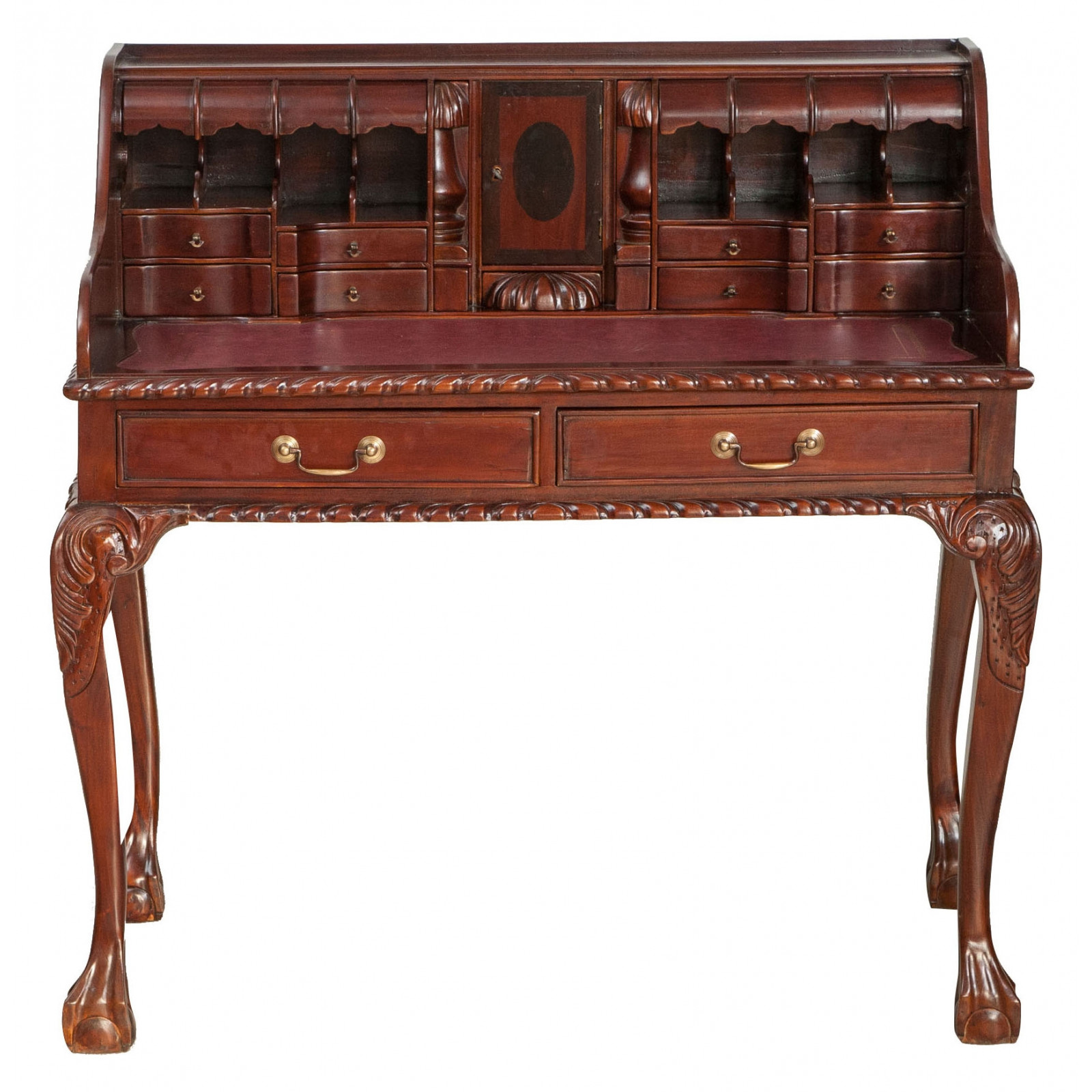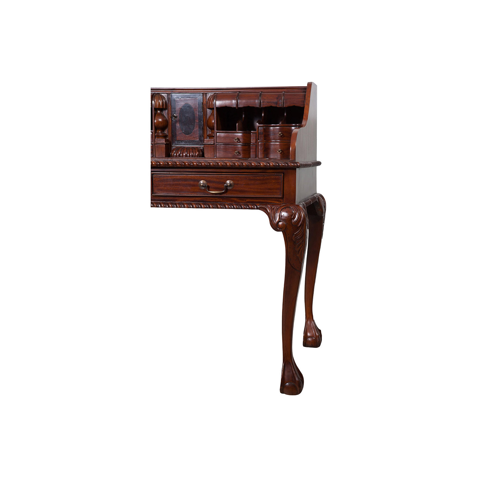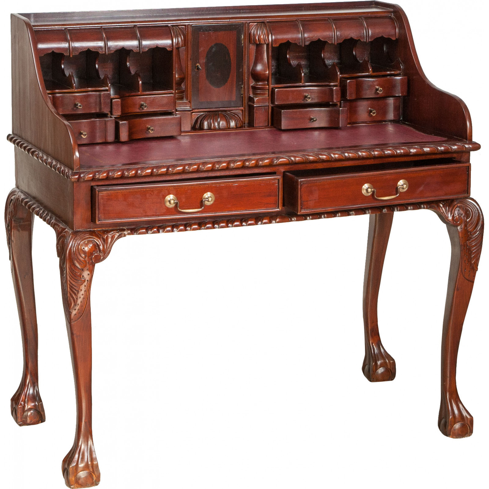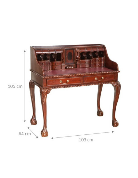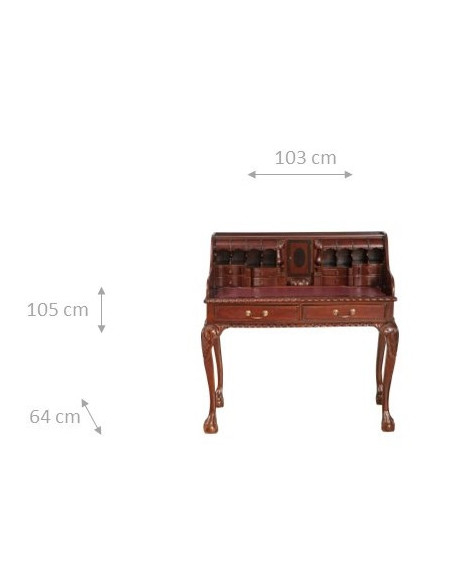 Naisen sihteeripöytä Chippendale-tyyliin 103x64x105 cm, valmistettu massiivimagonista puusta, kokonaan käsin veistetty. Siinä on kaksi käytännöllistä vetolaatikkoa, punaisella keinonahalla varustettu kirjoituskansi, jolle on asetettu korkeus, jossa on 8 laatikkoa ja seitsemän pientä ”salaa” laatikkoa. Siinä on myös suuri ”piilotettu” osasto, johon pääsee liu'uttamalla kirjoituspintaa.