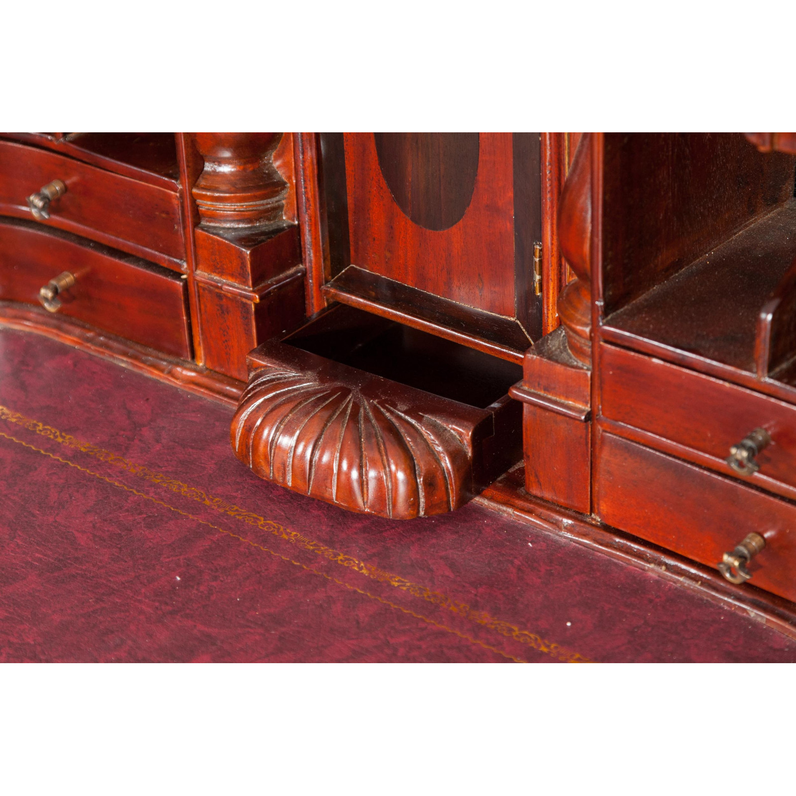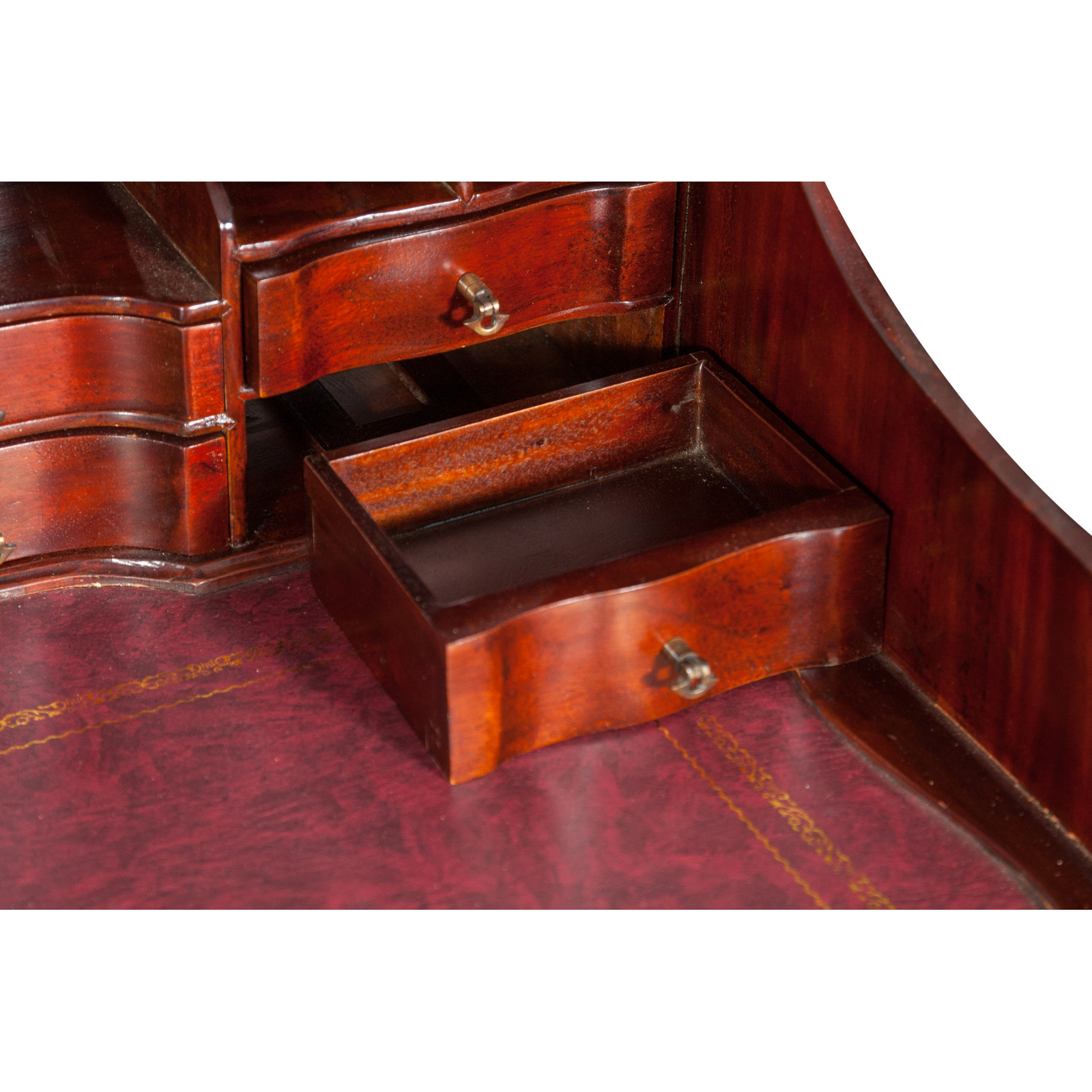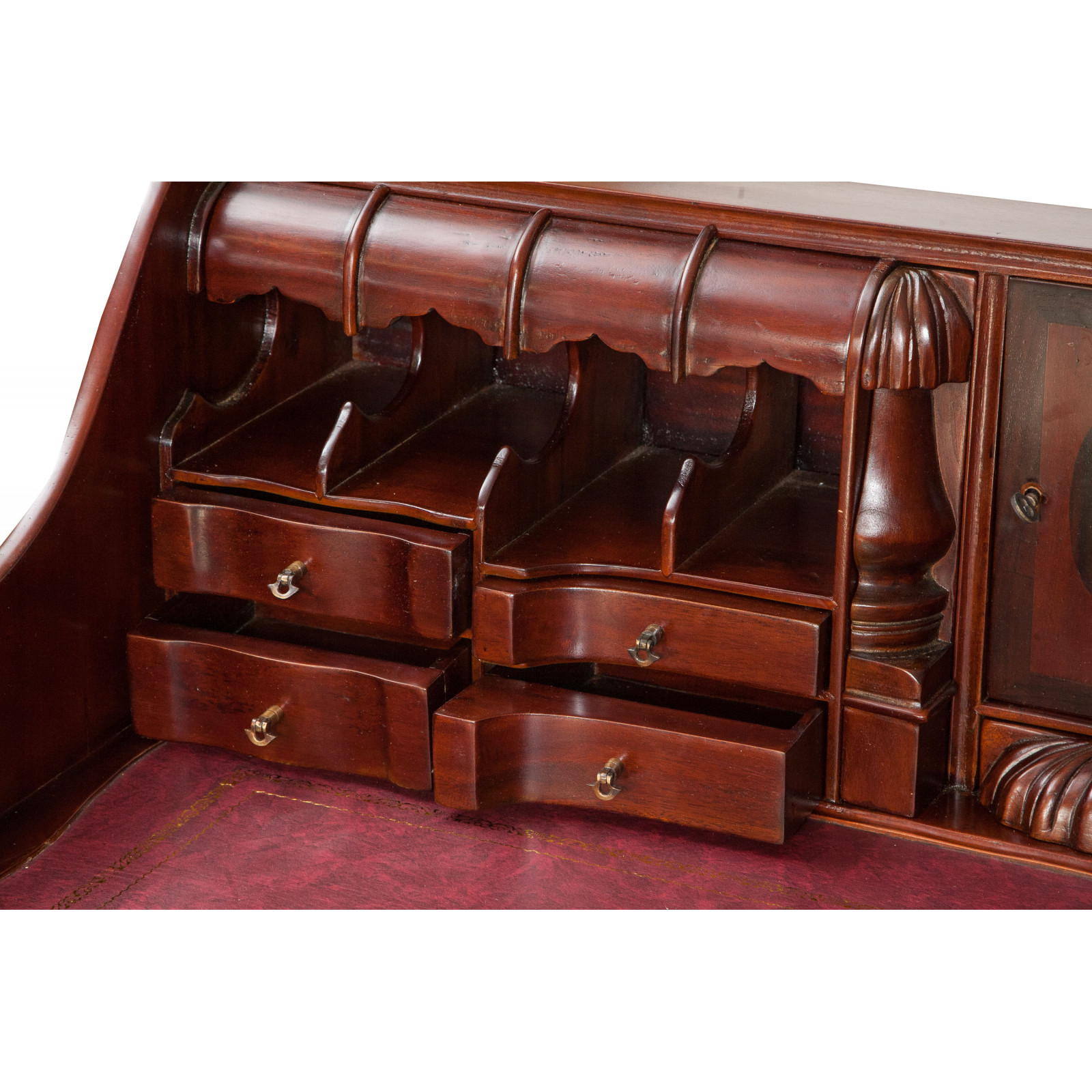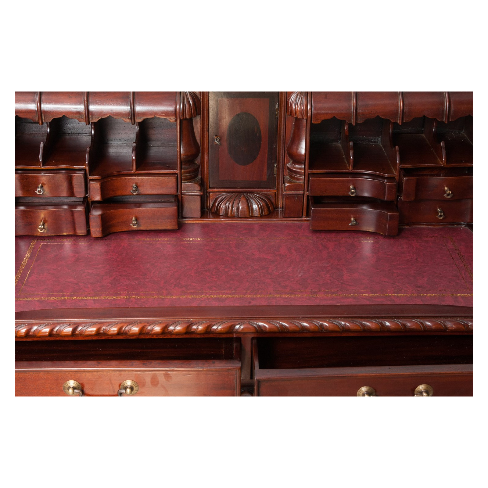 Naisen sihteeripöytä Chippendale-tyyliin 103x64x105 cm, valmistettu massiivimagonista puusta, kokonaan käsin veistetty. Siinä on kaksi käytännöllistä vetolaatikkoa, punaisella keinonahalla varustettu kirjoituskansi, jolle on asetettu korkeus, jossa on 8 laatikkoa ja seitsemän pientä ”salaa” laatikkoa. Siinä on myös suuri ”piilotettu” osasto, johon pääsee liu'uttamalla kirjoituspintaa.