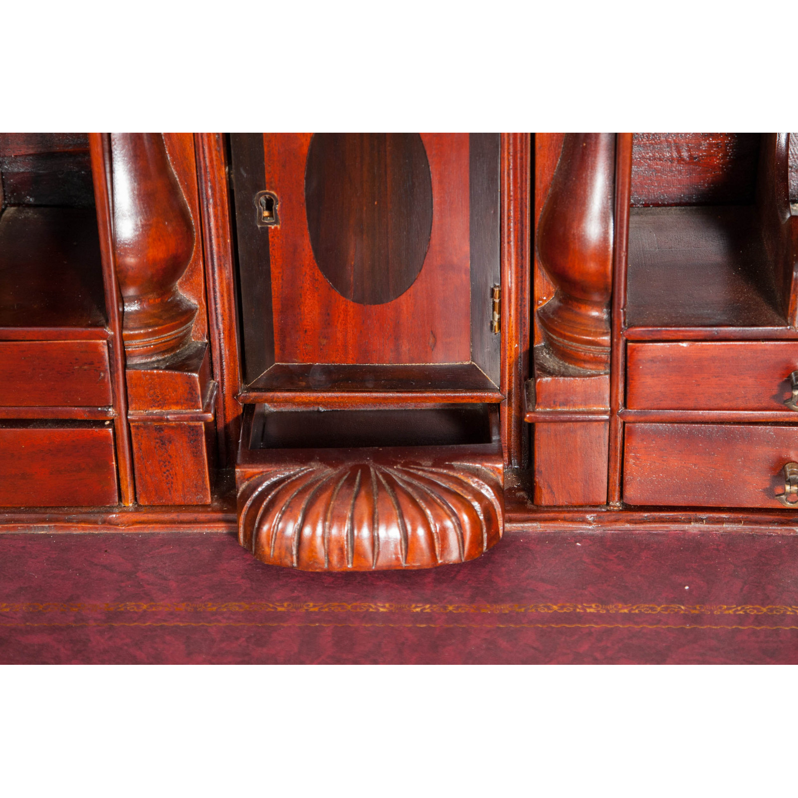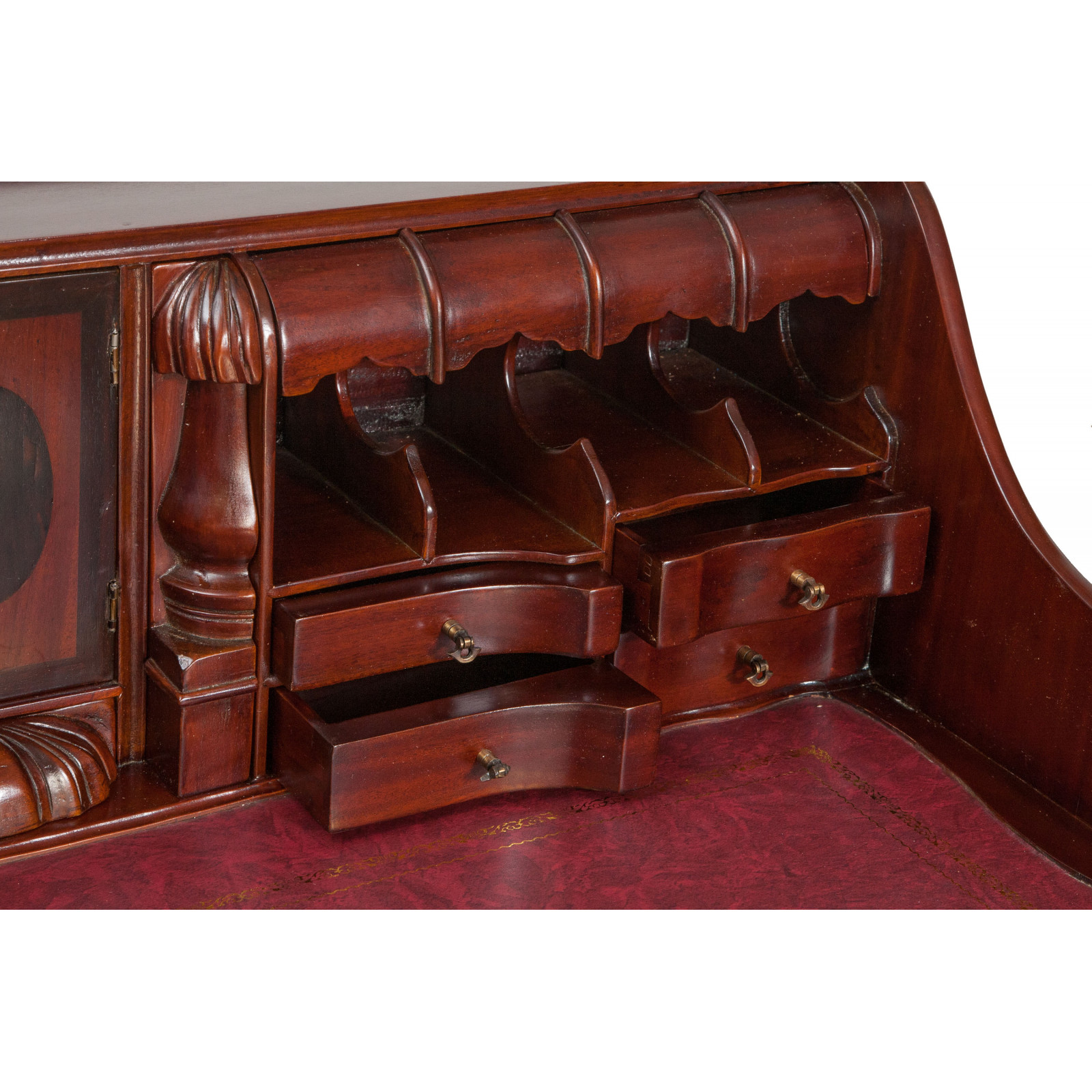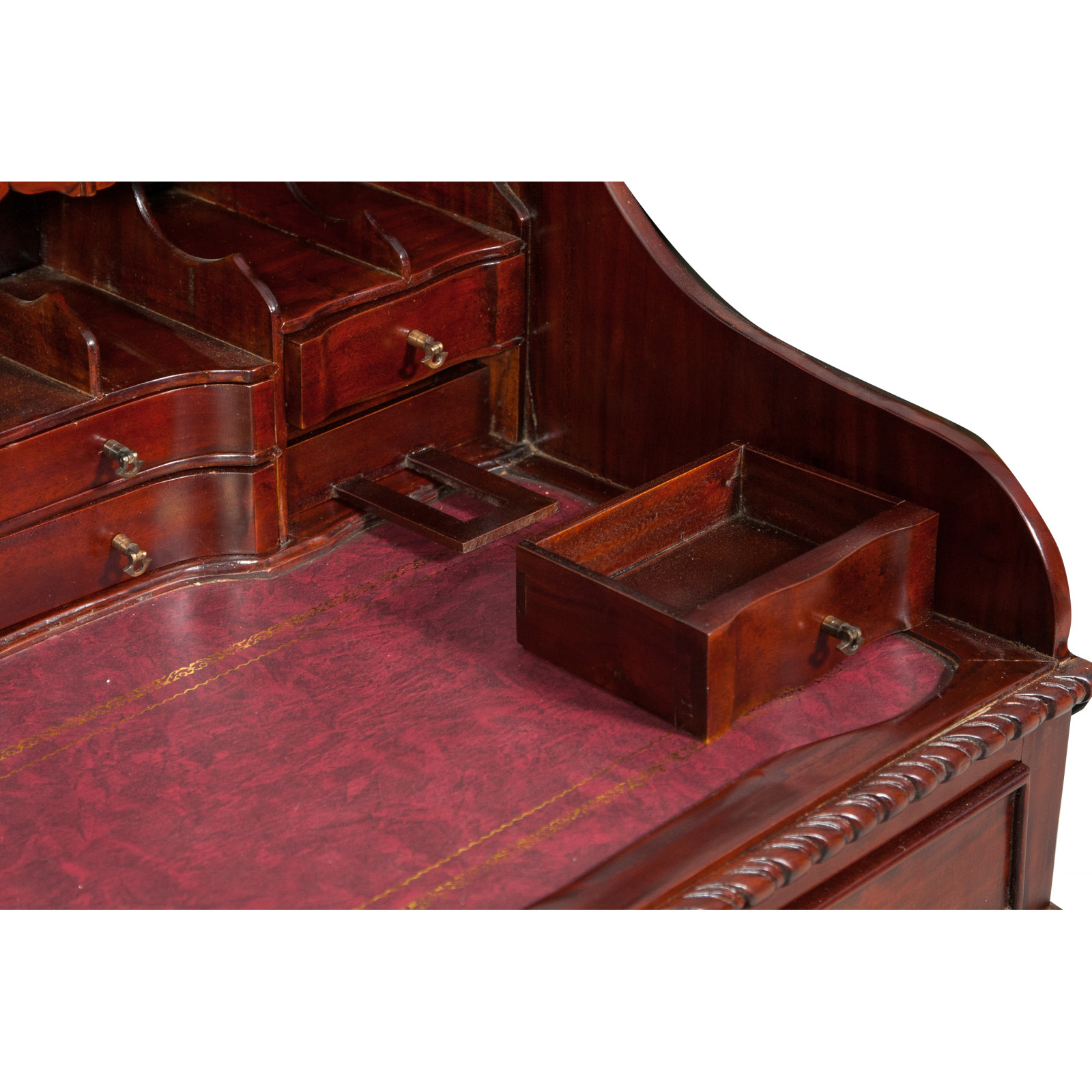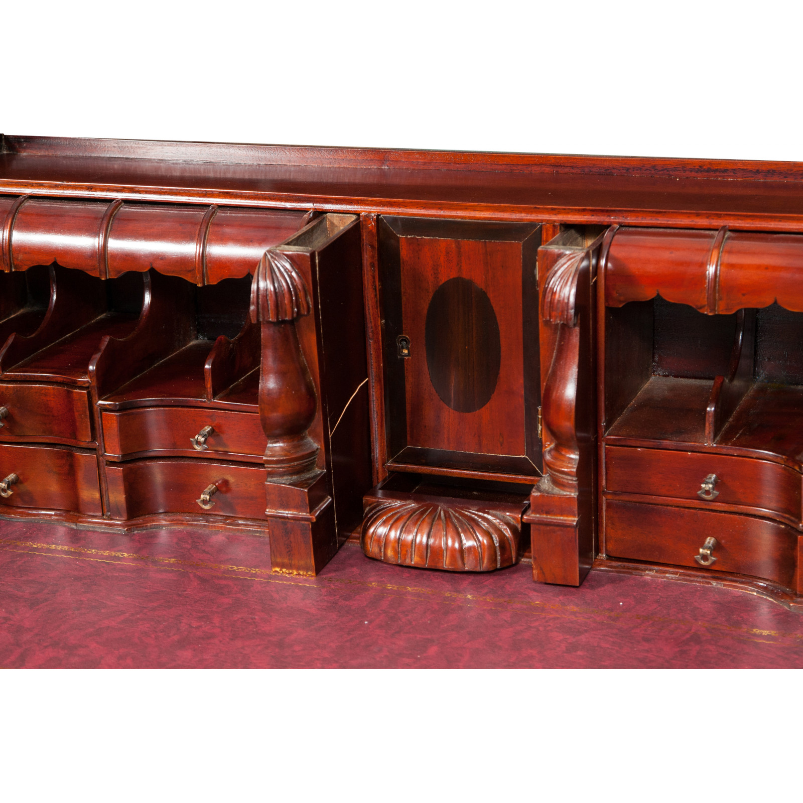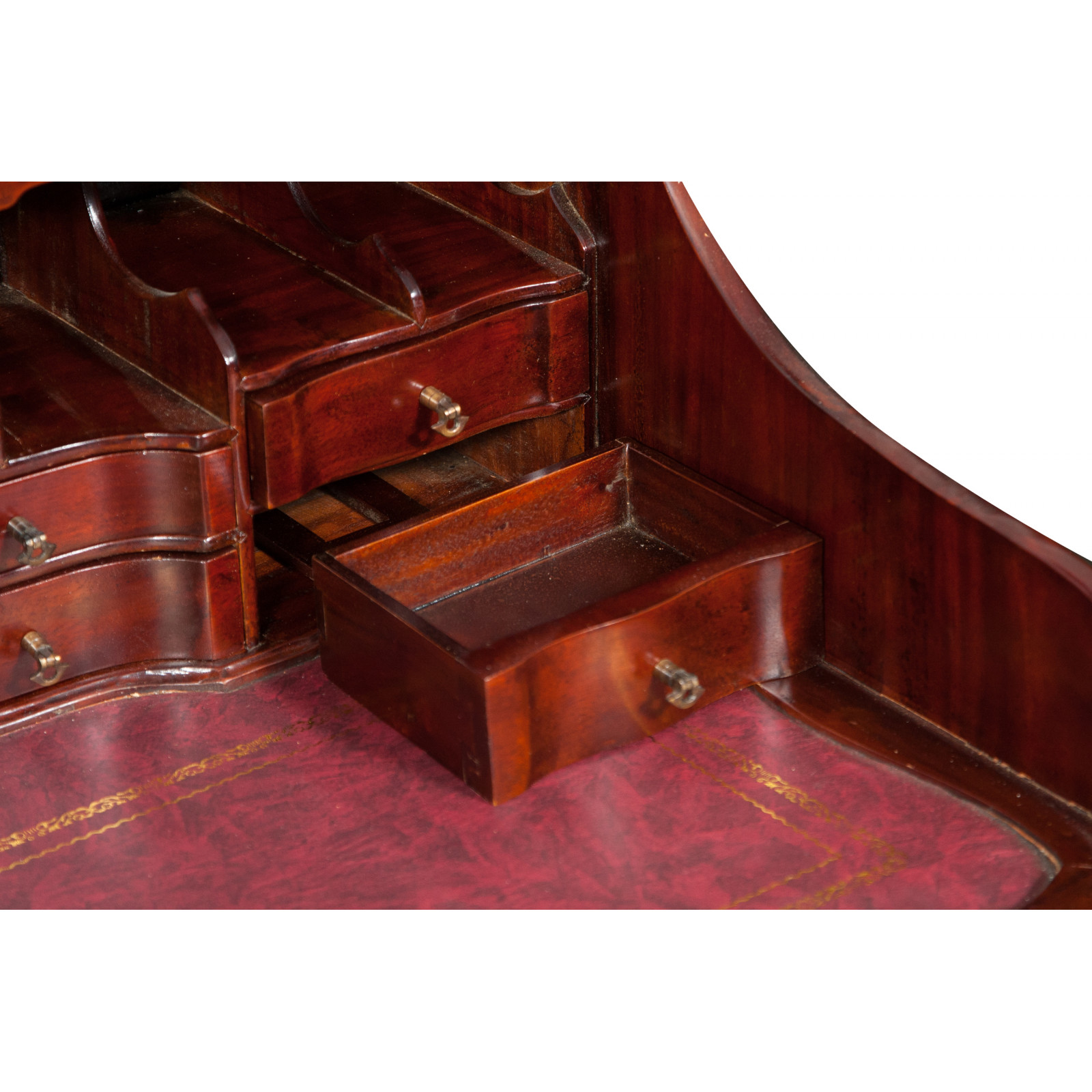 Naisen sihteeripöytä Chippendale-tyyliin 103x64x105 cm, valmistettu massiivimagonista puusta, kokonaan käsin veistetty. Siinä on kaksi käytännöllistä vetolaatikkoa, punaisella keinonahalla varustettu kirjoituskansi, jolle on asetettu korkeus, jossa on 8 laatikkoa ja seitsemän pientä ”salaa” laatikkoa. Siinä on myös suuri ”piilotettu” osasto, johon pääsee liu'uttamalla kirjoituspintaa.