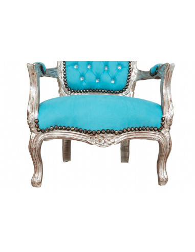 Ranskalainen Louis XVI -tyylinen lasten tuoli, massiivipyökkiä, käsin veistetty. Antiikkinen hopeanlehtiviimeistely, mitat 51 cm leveä, 50 cm syvä, 73 cm korkea. Käsintehty keinonahalla verhoiltu istuin ja selkänoja.