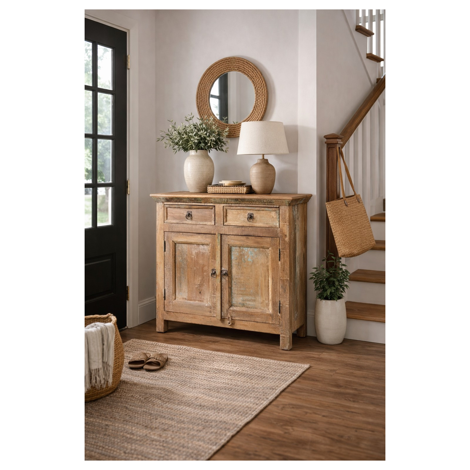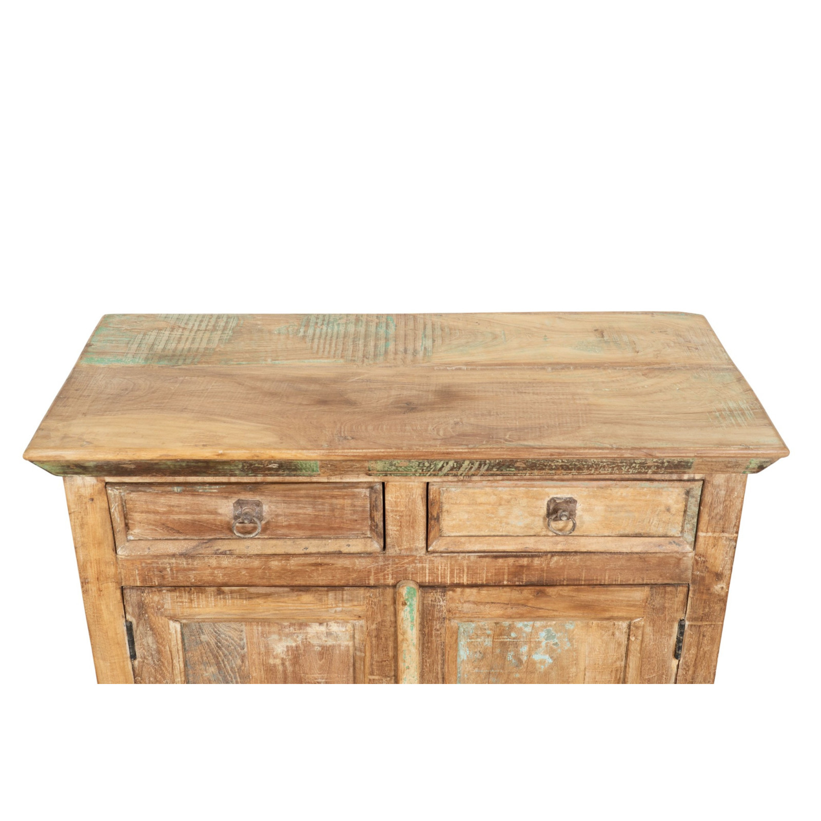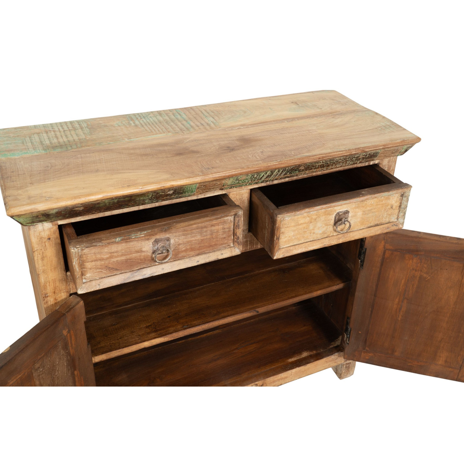 Vankka ja monipuolinen senkki, valmistettu kierrätetystä massiivipuusta. Käsin maalattu luonnollisilla maaleilla, monipuoliset sävyt tekevät jokaisesta huonekalusta ainutlaatuisen. Siinä on tilavat suljetut hyllyt, 2 ovea ja 2 keskimmäistä laatikkoa. Mitat L94xS38xK84 cm, sopii helposti mihin tahansa tilaan. Ihanteellinen antiikkihuonekalujen ja puun ystäville.