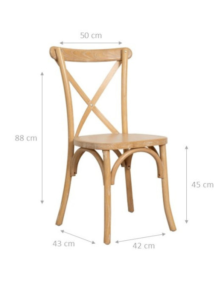 Thonet-tyylinen tuoli, jonka mitat ovat leveys 42 cm, syvyys 43 cm, korkeus 88 cm, valmistettu massiivituhkasta ja jossa on ristikkäinen selkänoja. Bistro-muotoilunsa ansiosta se sopii ihanteellisesti minkä tahansa huoneen tai paikan sisustamiseen vintage-tyyliin mukavuudesta tinkimättä. Korkeus lattiasta istuimeen on 45 cm.