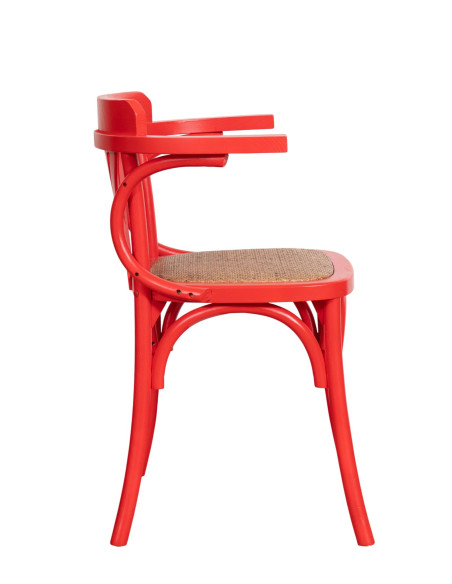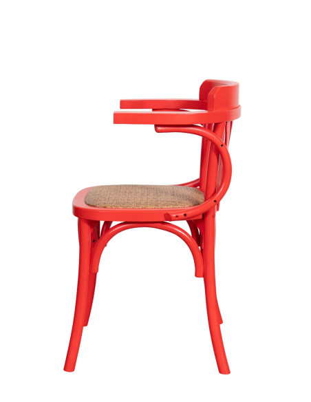 Thonet-tuoli käsinojilla, massiivista saarnipuusta, punainen viimeistely ja rottinkinen istuin