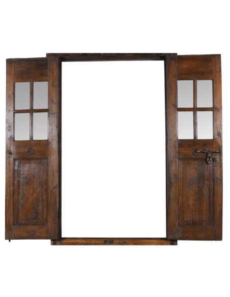 Vanha ja antiikkinen keskiaikainen sisä- tai ulko-ovi massiivipuusta ja raudasta, kehyksellä ja lasilla