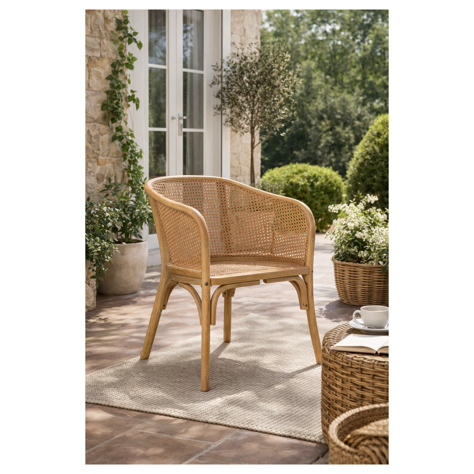 Chaises en bois massif mesurant 62 cm de large, 52 cm de profondeur et 78 cm de haut. Le fauteuil possède une assise en rotin et un dossier en paille viennoise travaillée à la main.