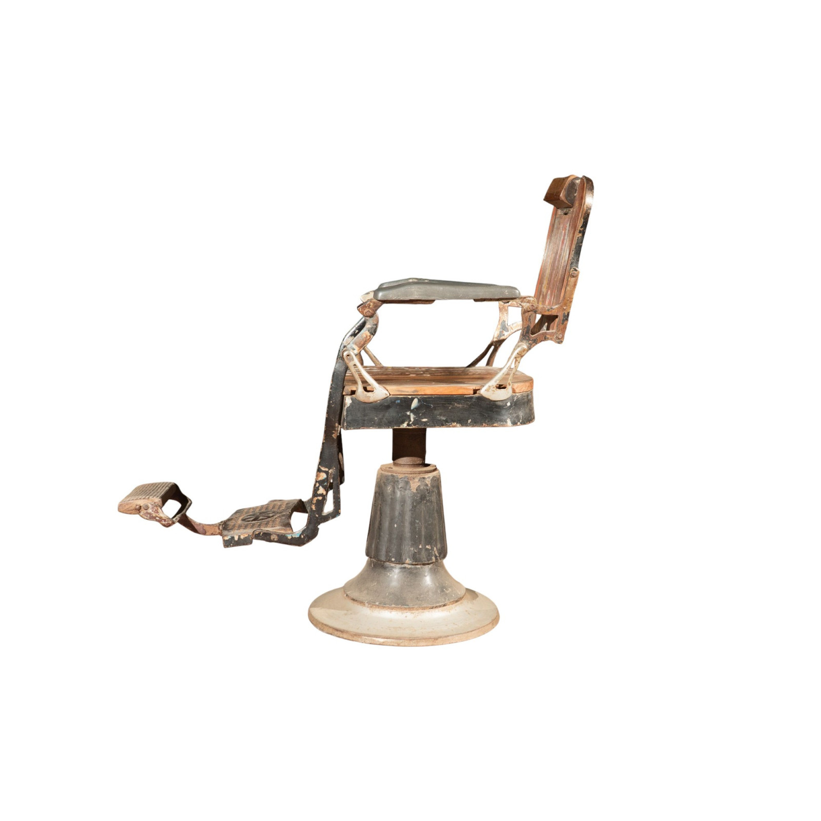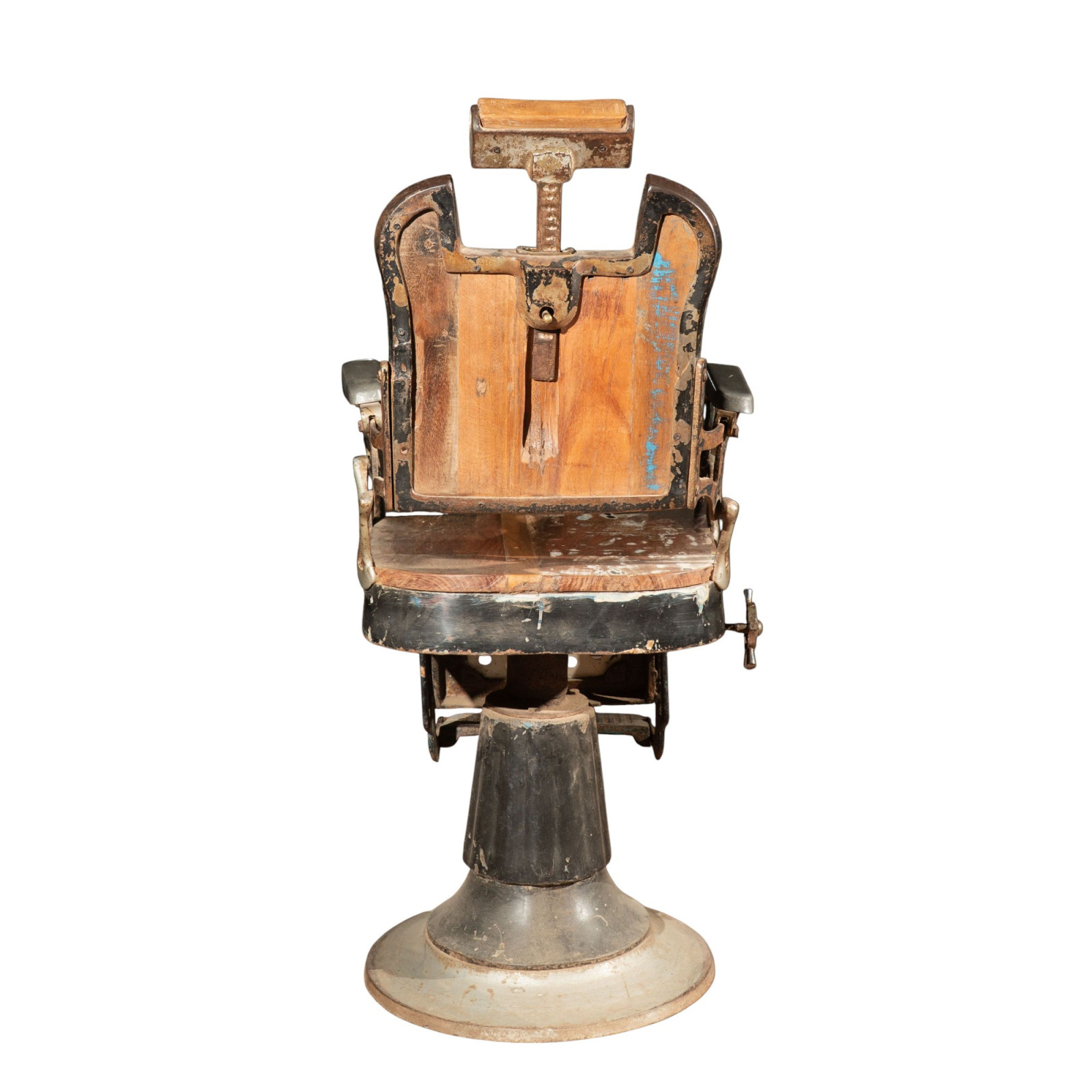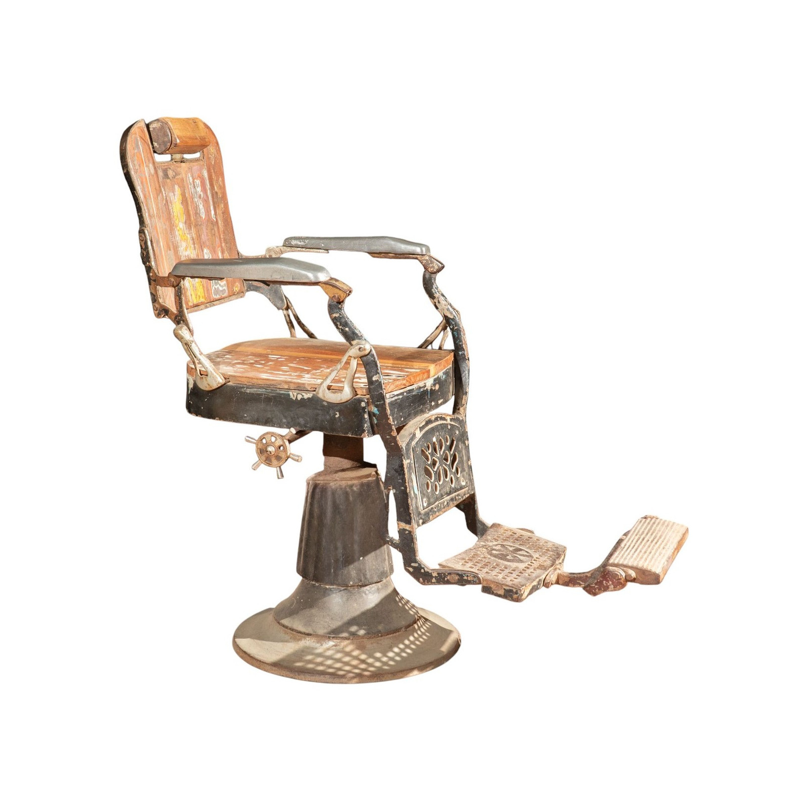 Ancien fauteuil de barbier de 78 cm de long, 56 cm de profondeur et 113 cm de haut. Ce fauteuil est un modèle original du XIXe siècle, finement restauré, en fer et en fonte, avec une assise et un dossier recouverts de bois.