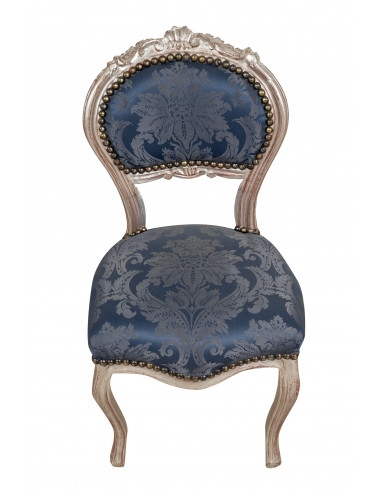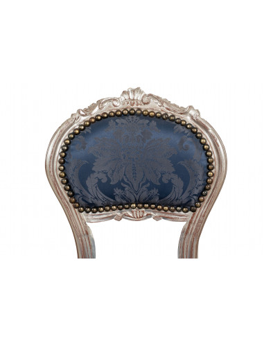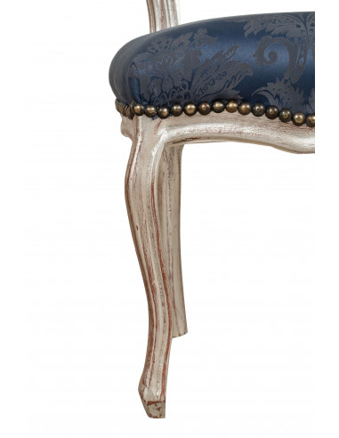 Fauteuil français de style Louis XVI en hêtre massif, finition argentée et bleue