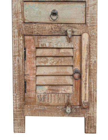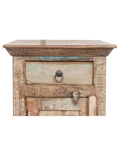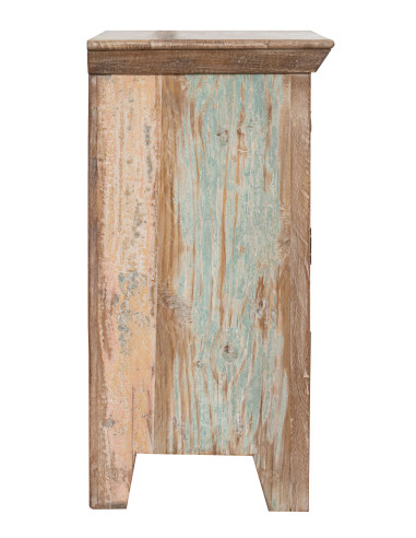 Table de chevet en bois massif recyclé de 43 cm de largeur, 33 cm de profondeur et 64 cm de hauteur. Peint à la main avec des vernis naturels, les nombreuses nuances rendent chaque meuble unique. Solide et fonctionnel, il est idéal pour les amateurs de meubles anciens et de bois.