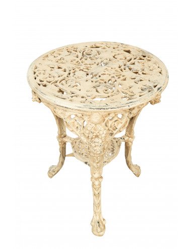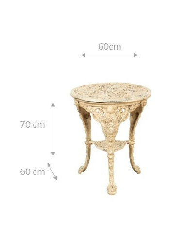 Table très robuste, stable et lourde en fonte d'un diamètre de 60 cm et d'une hauteur de 70 cm, avec une finition soignée entièrement réalisée à la main, obtenant un véritable effet antique. Décore avec élégance tout environnement intérieur ou extérieur. Toutes les mesures se réfèrent à la taille maximale de l'article.
