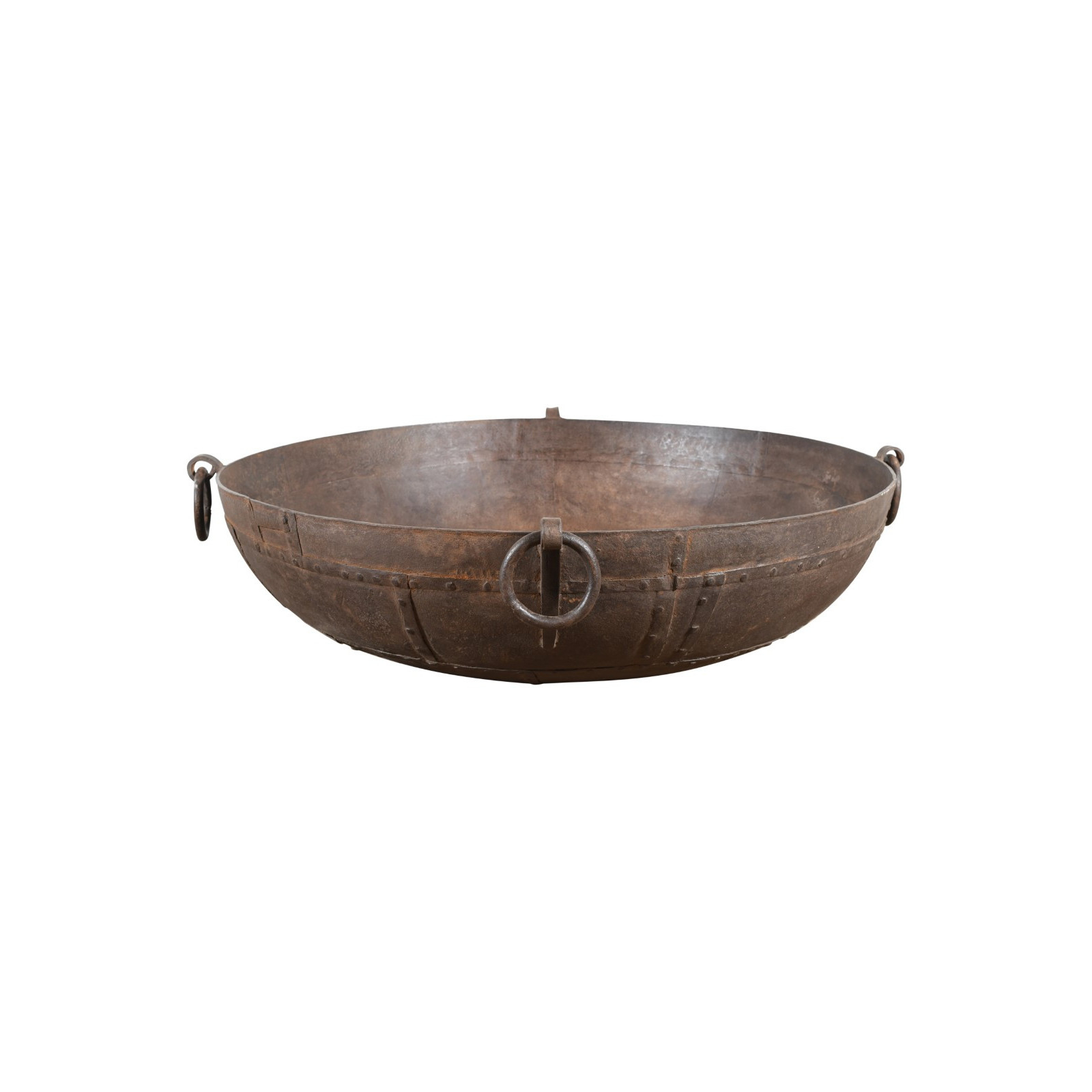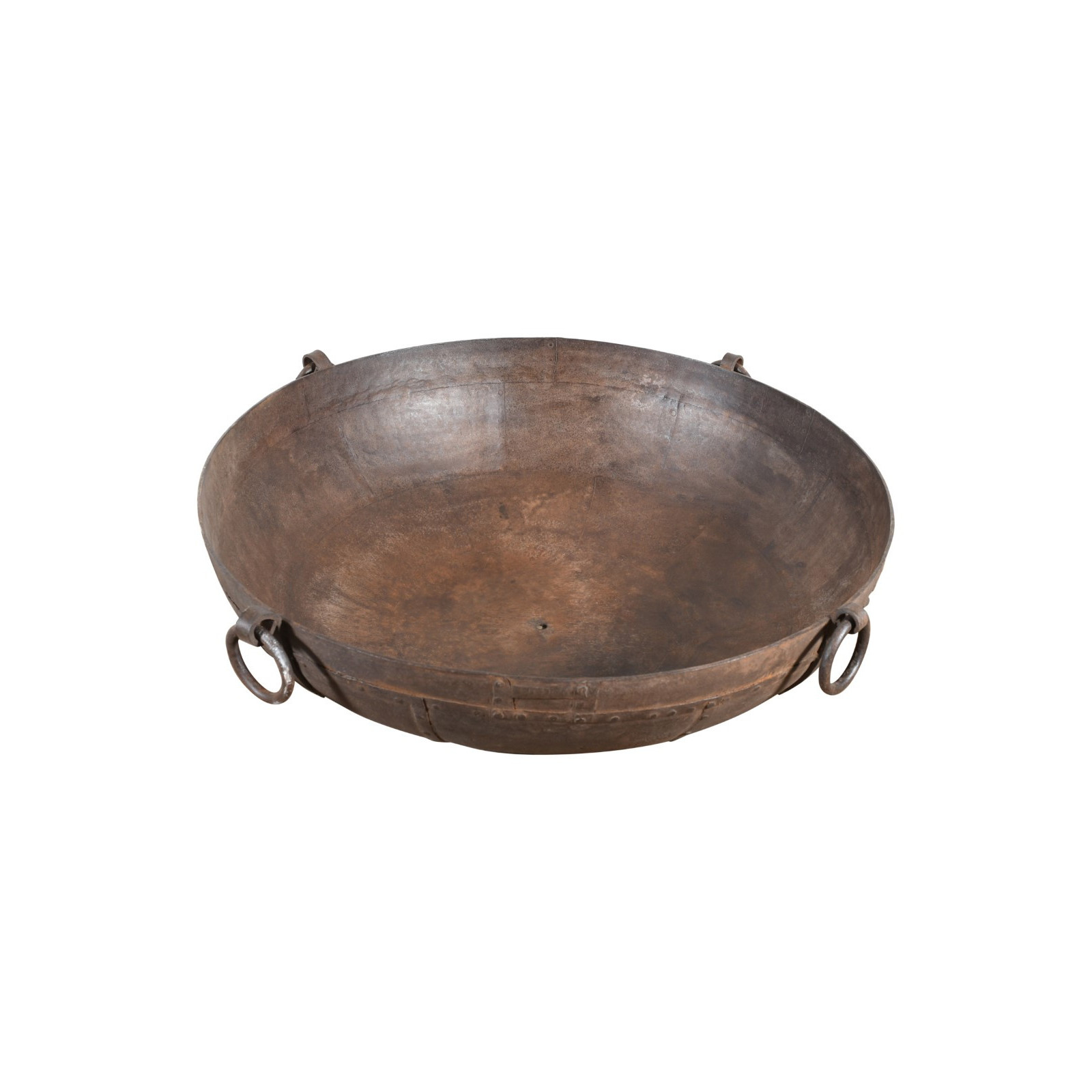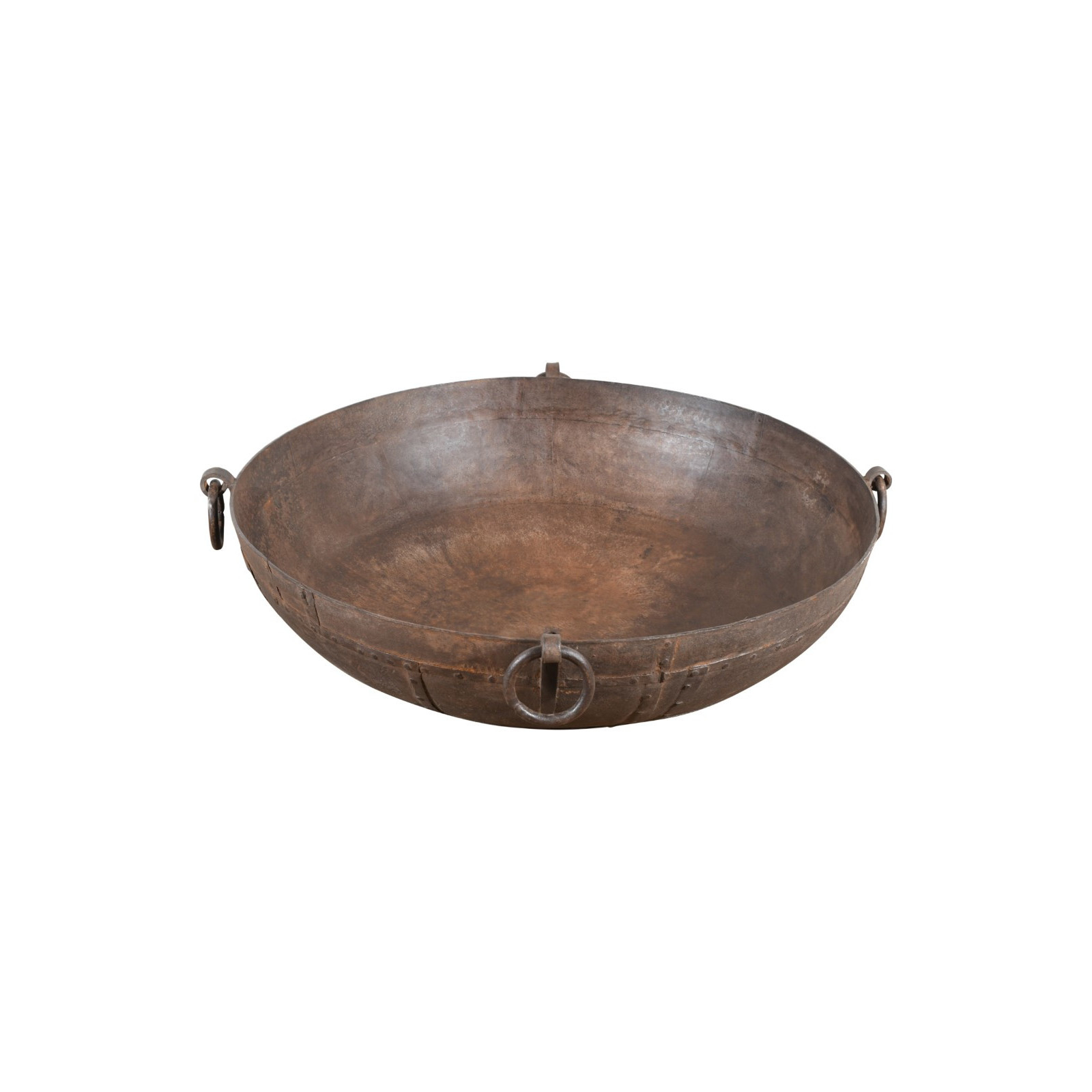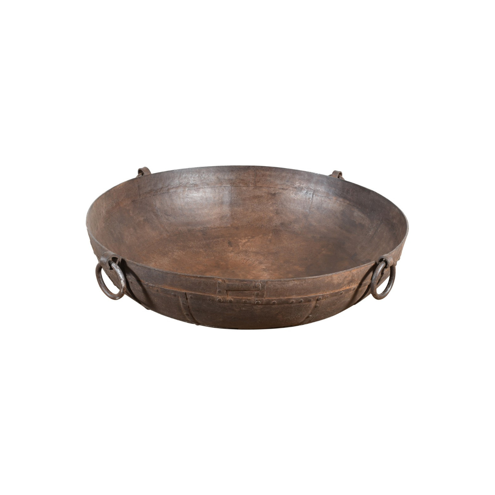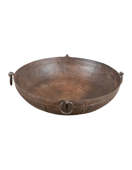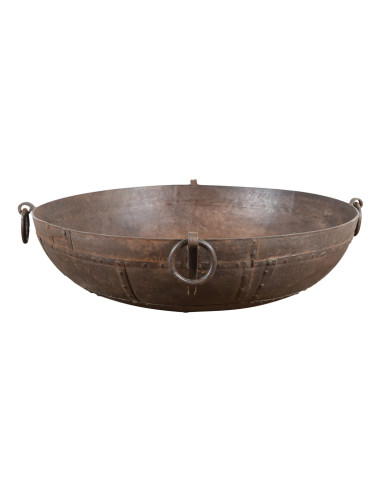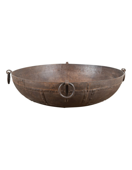 Ancien récipient/creuset de 144 cm de diamètre et 39 cm de hauteur. Réalisé en fer forgé, entièrement travaillé à la main, il peut également être utilisé comme barbecue original, brasero, jardinière, bassin pour nénuphars... ou comme simple décoration. Toutes les mesures se réfèrent à l'encombrement maximal de l'article.