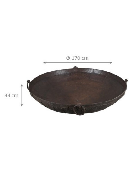 Ancien récipient/creuset de 170 cm de diamètre et 44 cm de hauteur. Réalisé en fer forgé, entièrement travaillé à la main, il peut également être utilisé comme barbecue original, brasero, jardinière, bassin pour nénuphars... ou comme simple décoration. Toutes les mesures se réfèrent à l'encombrement maximal de l'article.