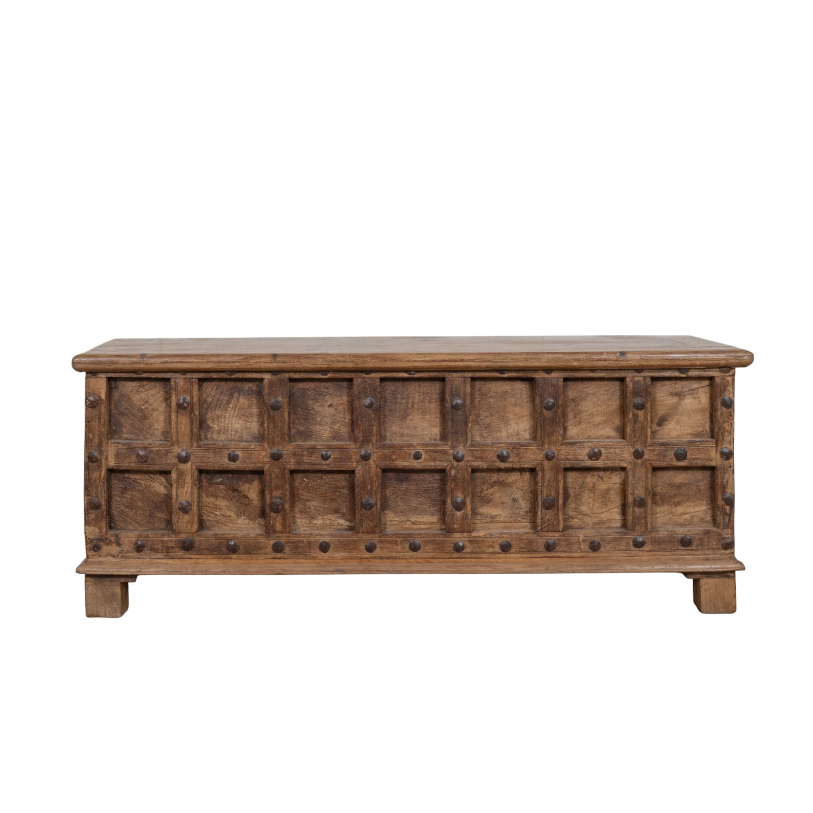 Tárolószekrény újrahasznosított tömör fából, méretei: szélesség 140 cm, mélység 67 cm, magasság 55 cm. Szilárd és funkcionális, ideális az antik bútorok és a fa szerelmeseinek. Minden bútor egyedi darab.