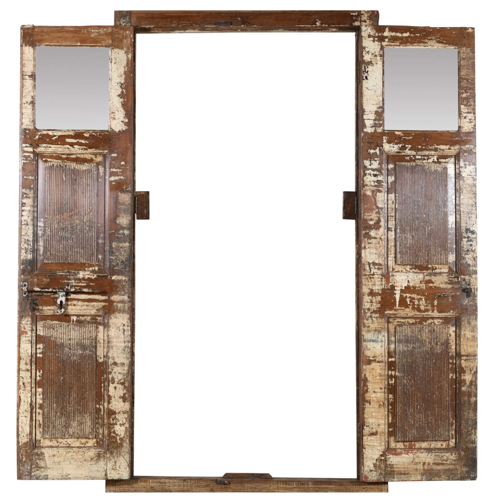 Régi, középkori, tömör fából és vasból készült beltéri vagy kültéri ajtó, kerettel és üveggel