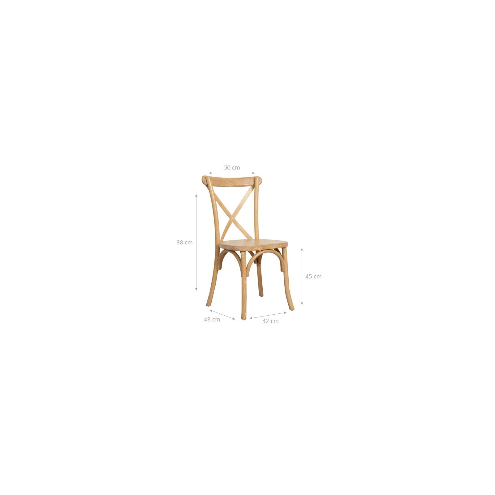 Szék, szélessége 42 cm, mélysége 43 cm, magassága 88 cm, Thonet stílusban, tömör kőrisből, keresztezett háttámlával. Bisztró kialakításának köszönhetően ideális bármely helyiség vagy helyszín vintage stílusú berendezéséhez, a kényelem feláldozása nélkül. A padlótól az ülőfelületig 45 cm magas.Minden mérés a cikk maximális összméretére vonatkozik.