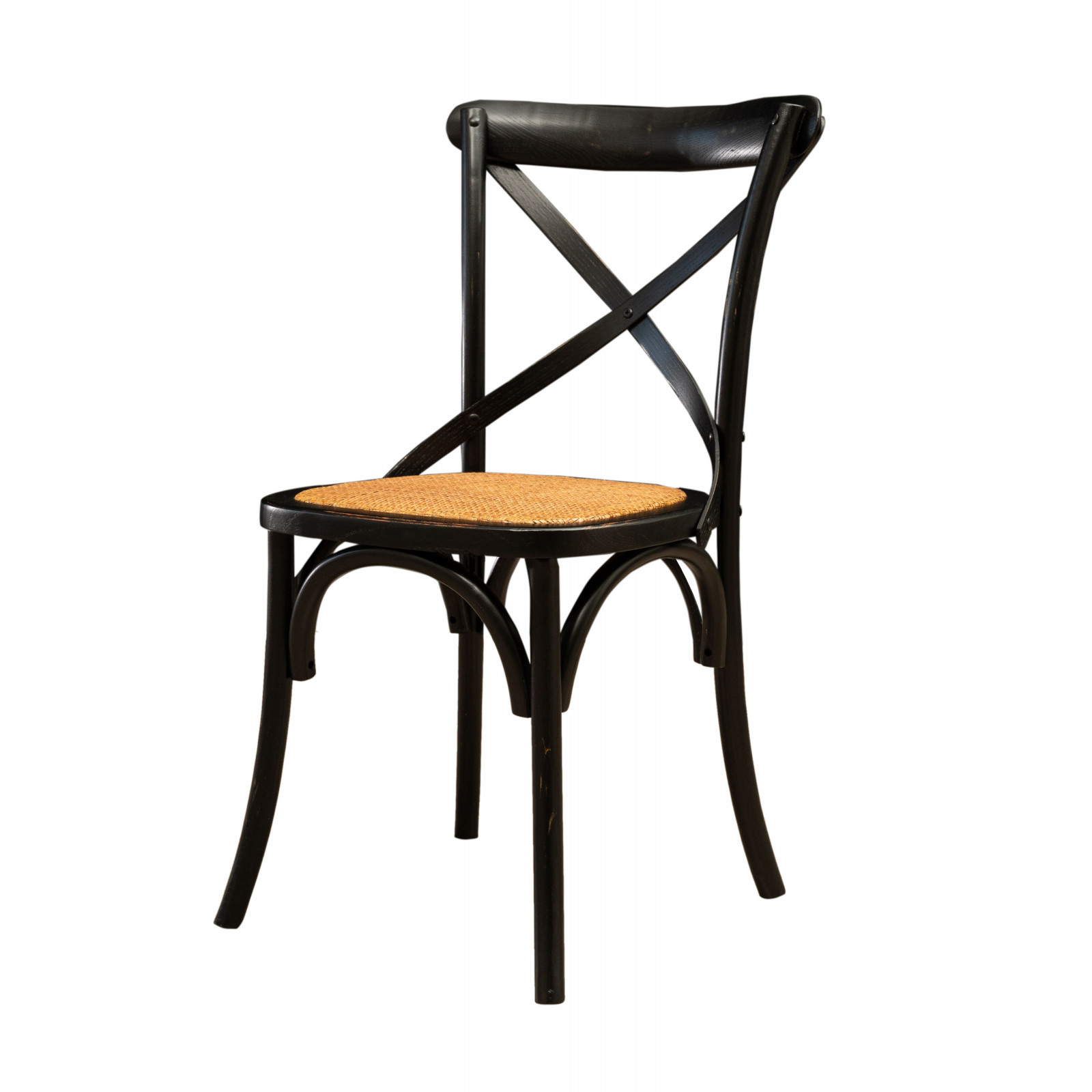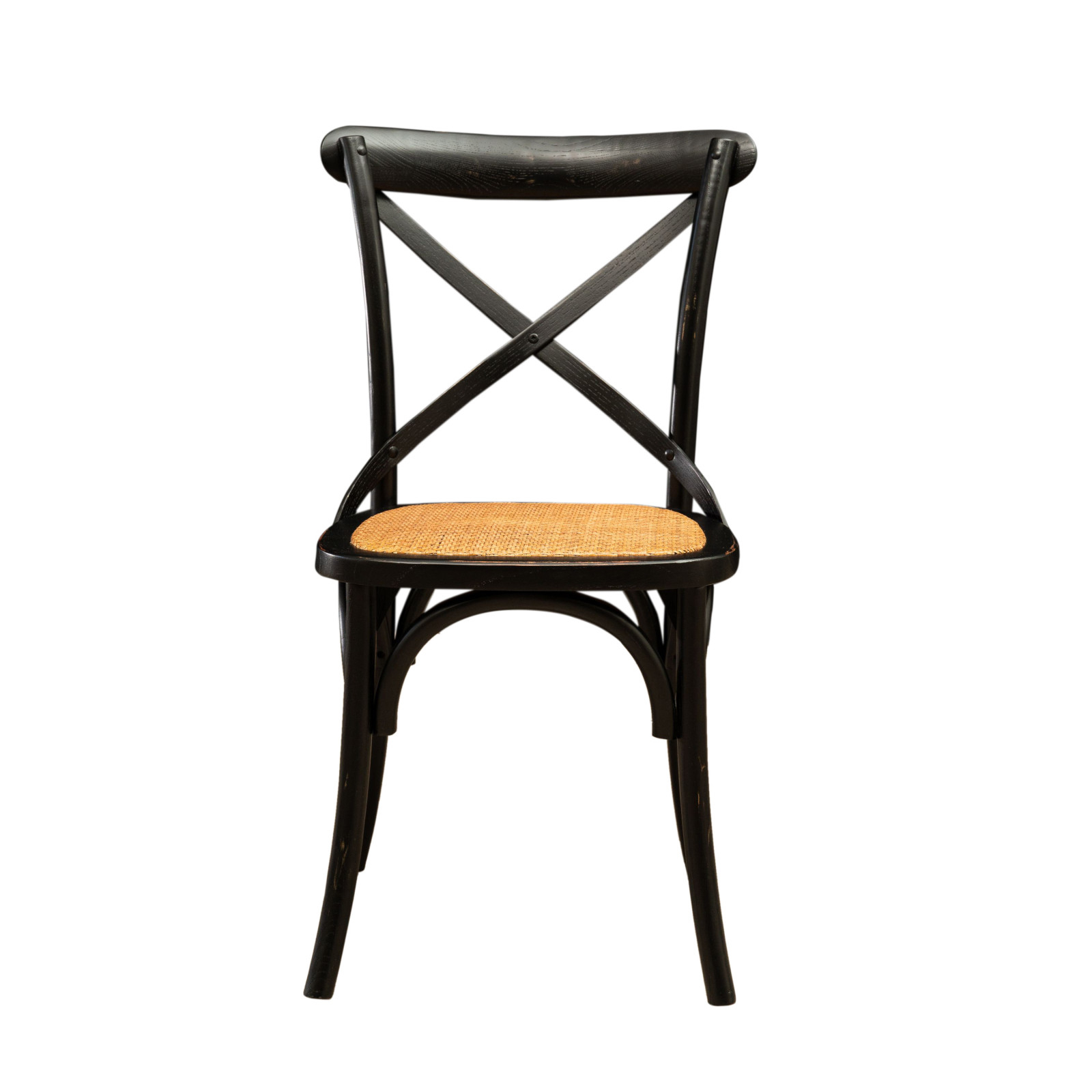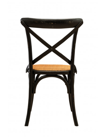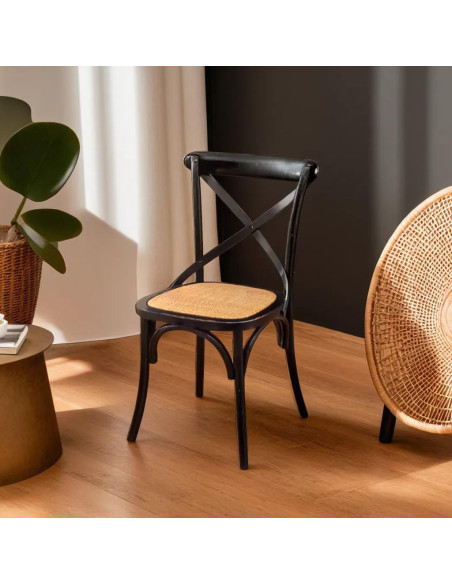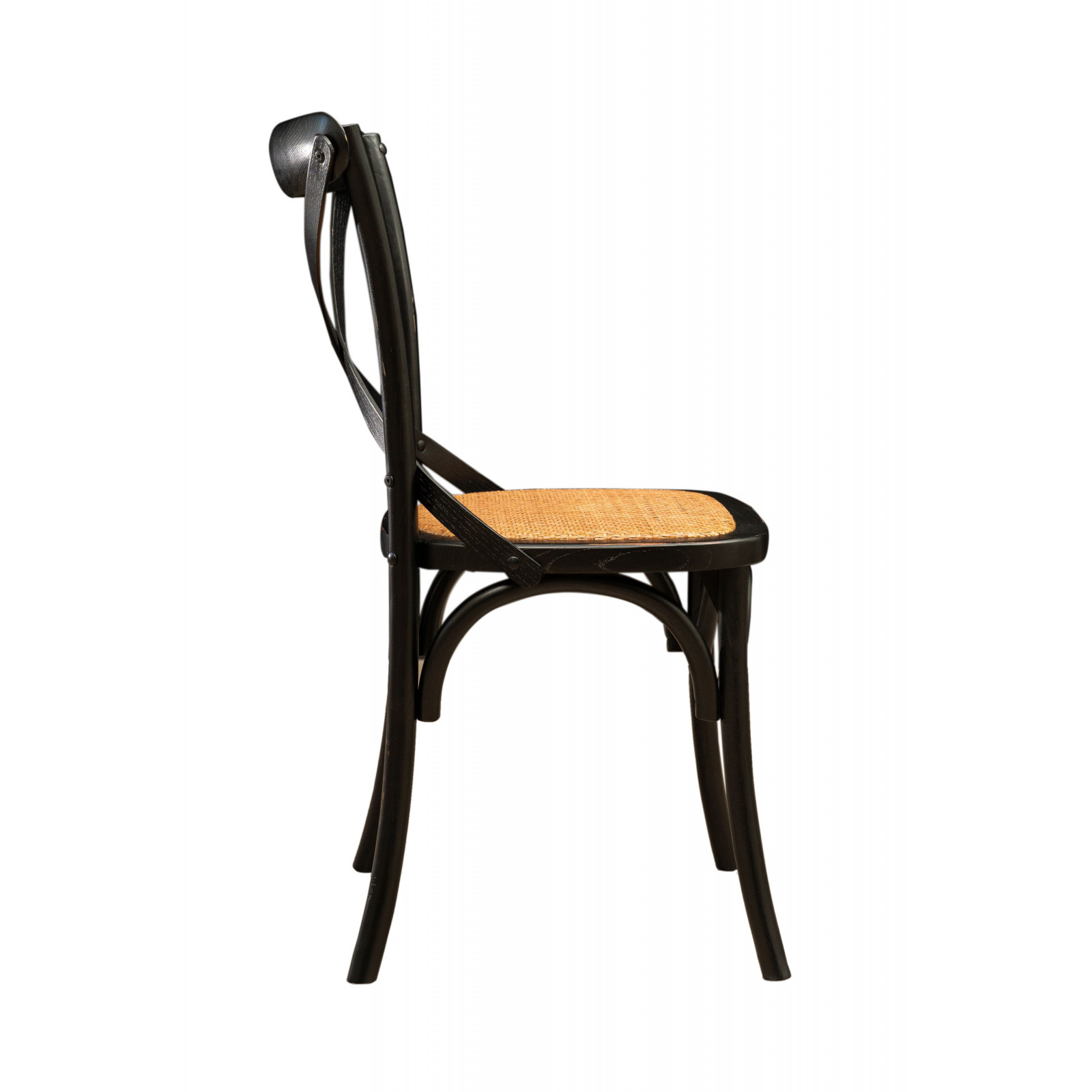Szék szélessége 48 cm, mélysége 52 cm, magassága 88 cm, Thonet stílusban, tömör kőrisből, keresztezett háttámlával és fonott rattan ülőfelülettel. Bisztró kialakításának köszönhetően ideális bármilyen szoba vagy helyiség vintage stílusú díszítésére a kényelem feláldozása nélkül.