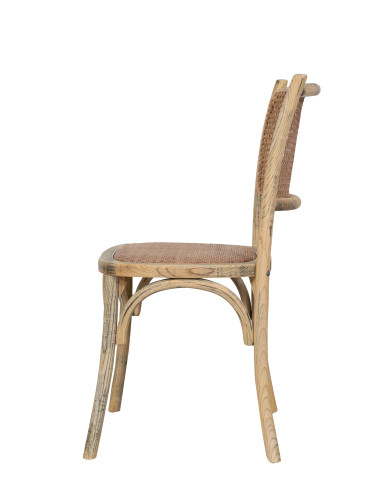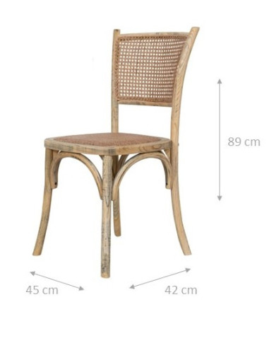 Szék, szélessége 48 cm, mélysége 52 cm, magassága 88 cm, Thonet stílusban, tömör kőrisből, keresztezett háttámlával és fonott rattanszálas ülőfelülettel. Bisztró kialakításának köszönhetően ideális bármely helyiség vagy helyszín vintage stílusú berendezéséhez, anélkül, hogy a kényelmet feláldozná.Minden méret a cikk maximális teljes méretére vonatkozik.