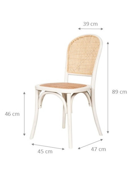 Ez a Thonet stílusú szék 45 cm széles, 47 cm mély és 89 cm magas. Tömör kőrisfából készült, fonott rattan háttámlával és ülőfelülettel. Bisztró stílusú kialakításának köszönhetően ideális bármilyen helyiség vagy helyszín vintage hangulatú berendezéséhez, a kényelem feláldozása nélkül.