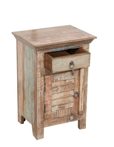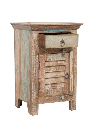 Újrahasznosított tömör fából készült éjjeliszekrény, méretei: szélesség 43 cm, mélység 33 cm, magasság 64 cm. Kézzel, természetes lakkokkal festett, a sokféle árnyalat minden bútordarabot egyedivé tesz. Szilárd és funkcionális, ideális az antik bútorok és a fa szerelmeseinek.