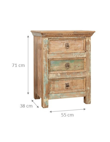 3 fiókos éjjeliszekrény, újrahasznosított tömör fából, méretei: szélesség 55 cm, mélység 38 cm, magasság 71 cm. Kézzel festett, természetes festékekkel, a sokféle árnyalatok minden bútort egyedivé tesznek. Szilárd és funkcionális, ideális az antik bútorok és a fa szerelmeseinek.