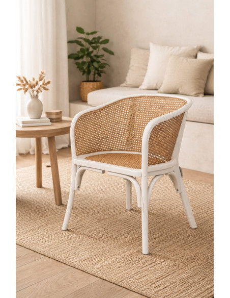 Tömörfa székek, melyek szélessége 62 cm, mélysége 52 cm és magassága 78 cm. A karosszék rattan ülőfelülettel és kézzel készített bécsi szalmából készült háttámlával rendelkezik.