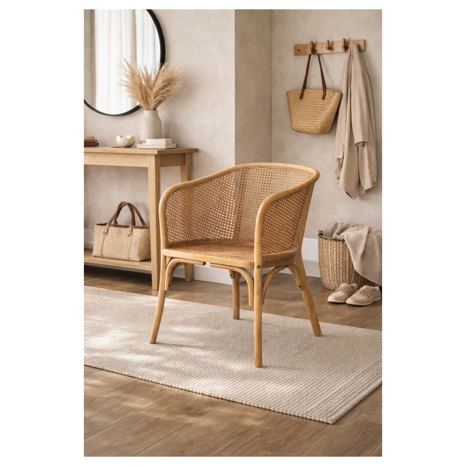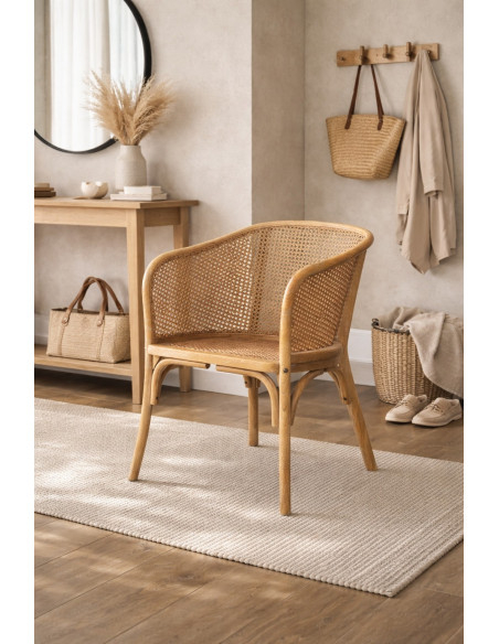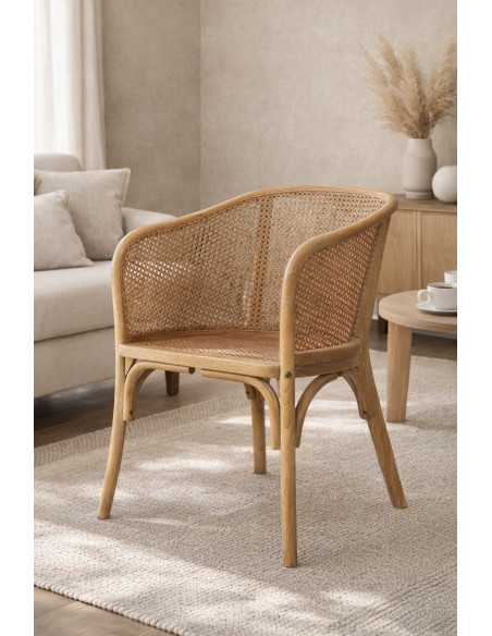 Tömörfa székek, melyek szélessége 62 cm, mélysége 52 cm és magassága 78 cm. A karosszék rattan ülőfelülettel és kézzel készített bécsi szalmából készült háttámlával rendelkezik.