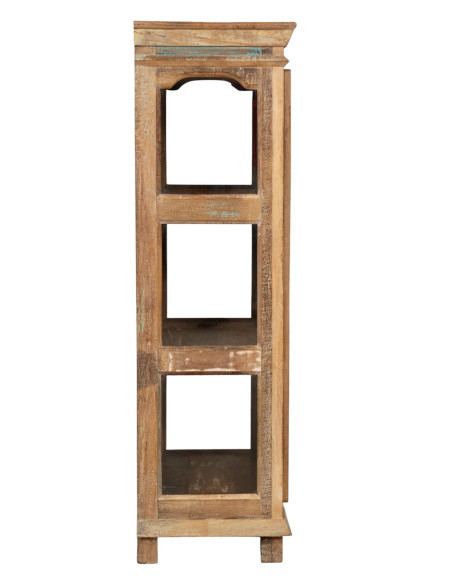 A vitrin újrahasznosított tömör fából készült, méretei: szélesség 60 cm, mélység 40 cm, magasság 136 cm. Kézzel festett, természetes festékekkel, a sokféle árnyalat teszi a bútort egyedivé. Szilárd és funkcionális, ideális az antik bútorok és a fa szerelmeseinek.