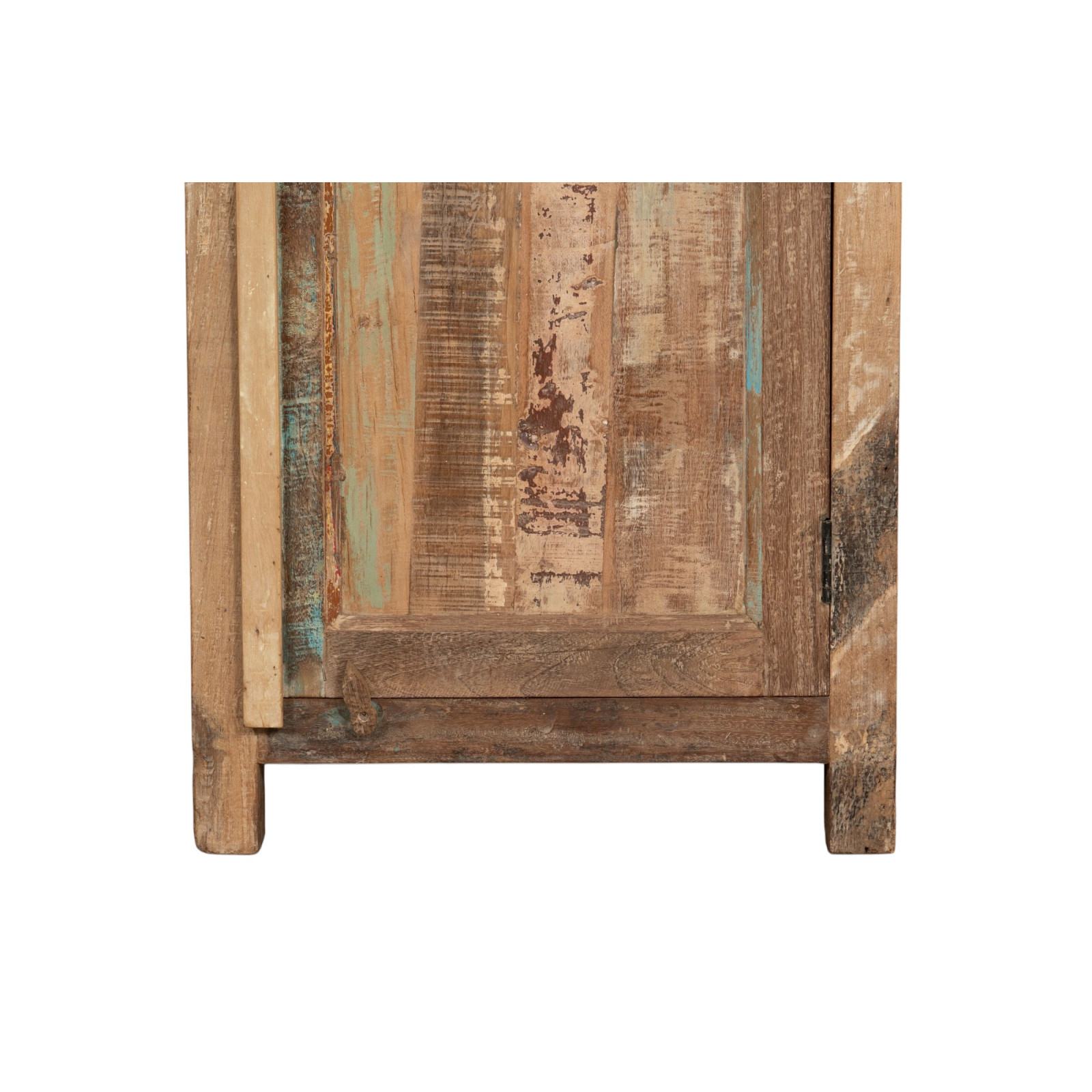 A vitrin újrahasznosított tömör fából készült, méretei: szélesség 63 cm, mélység 42 cm, magasság 180 cm. Kézzel festett, természetes festékekkel, a sokféle árnyalat teszi a bútort egyedivé. Szilárd és funkcionális, ideális az antik bútorok és a fa szerelmeseinek.