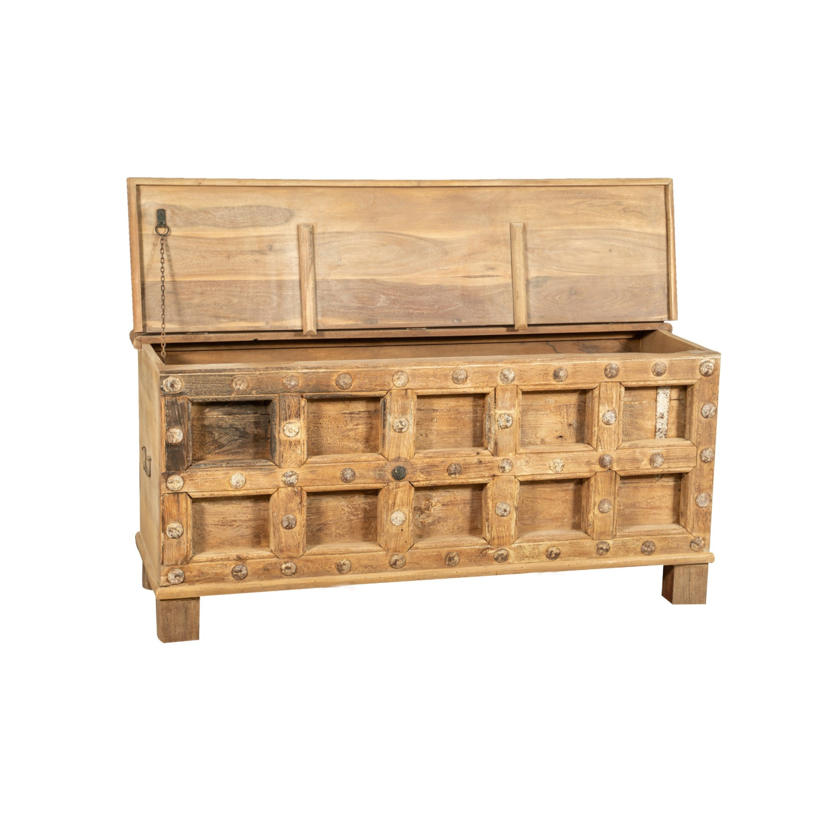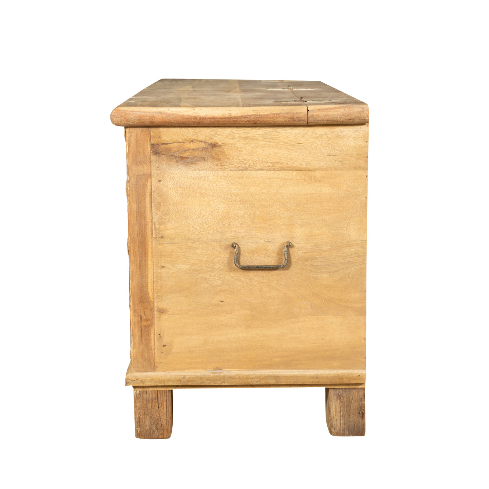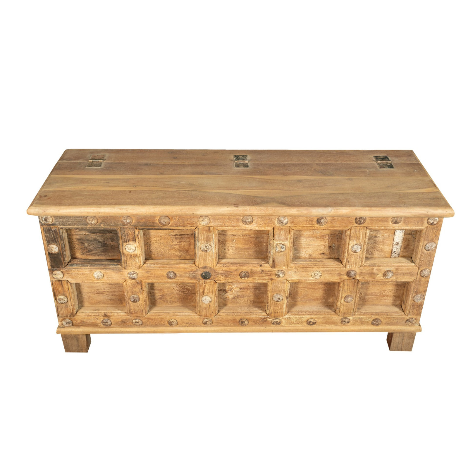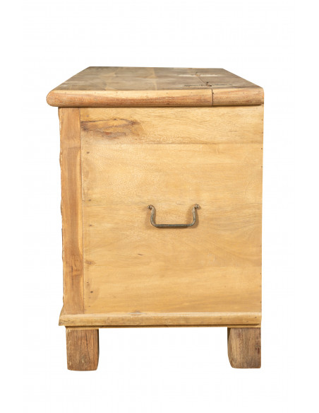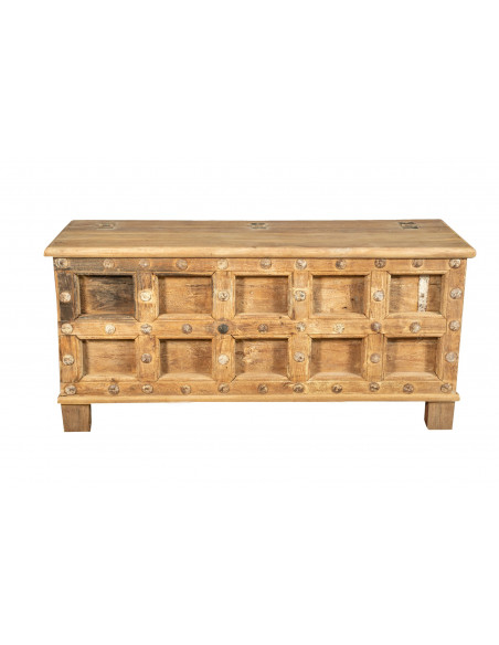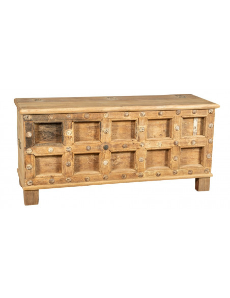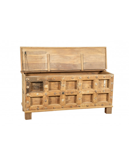 Cassapanca antica originale in legno di teak intagliato con finitura decapata