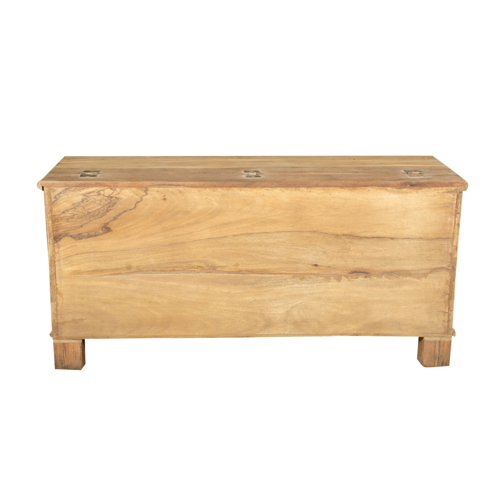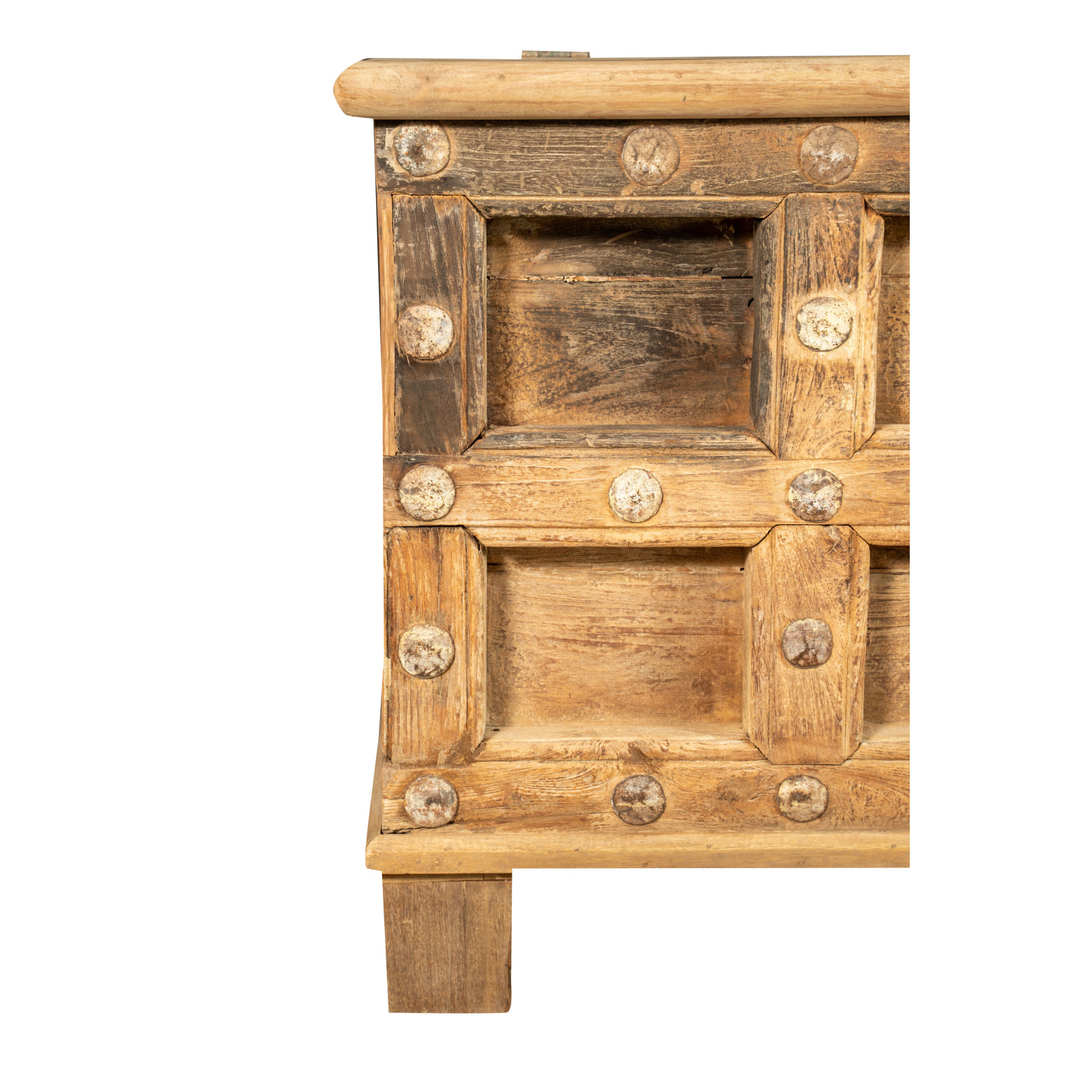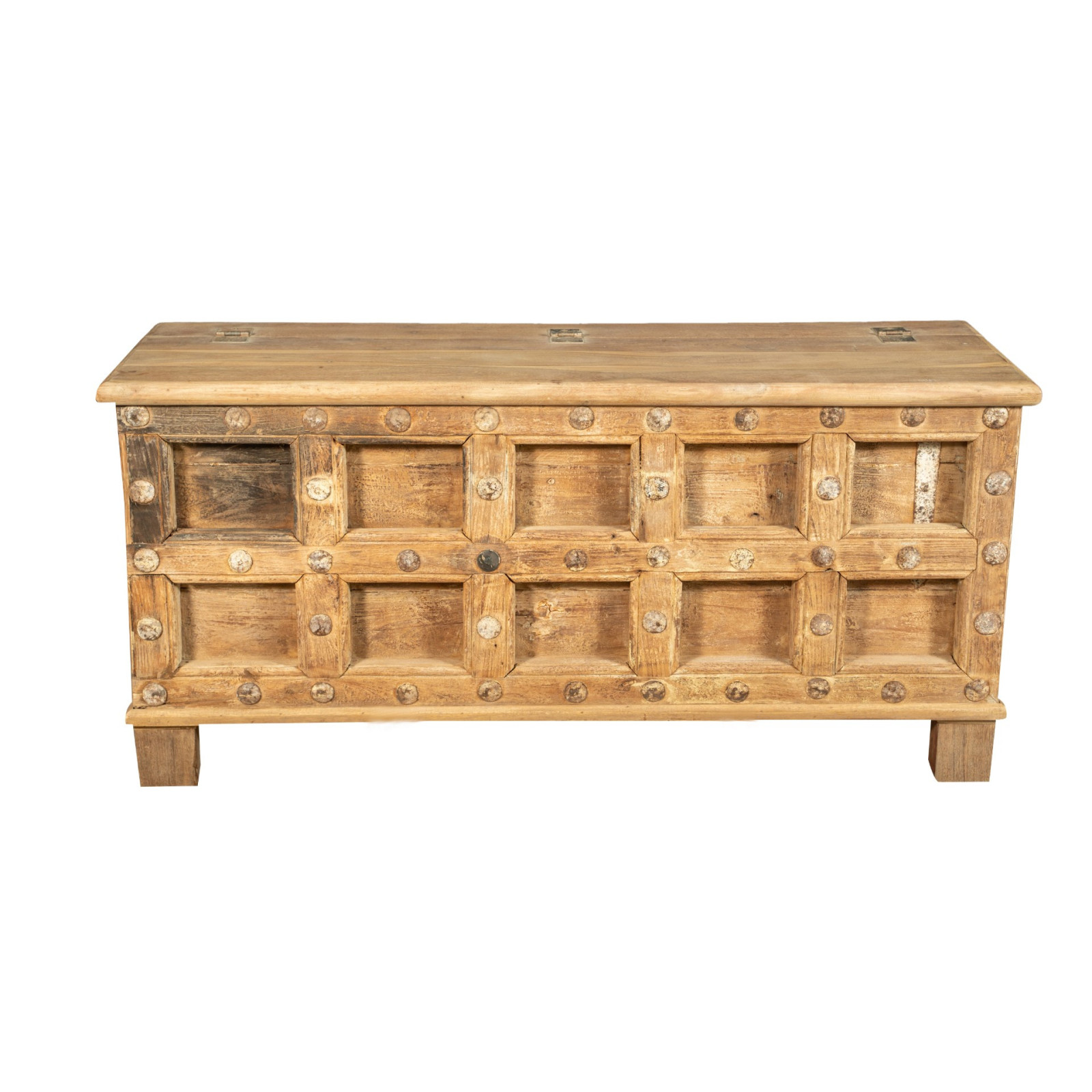 Cassapanca antica originale in legno di teak intagliato con finitura decapata