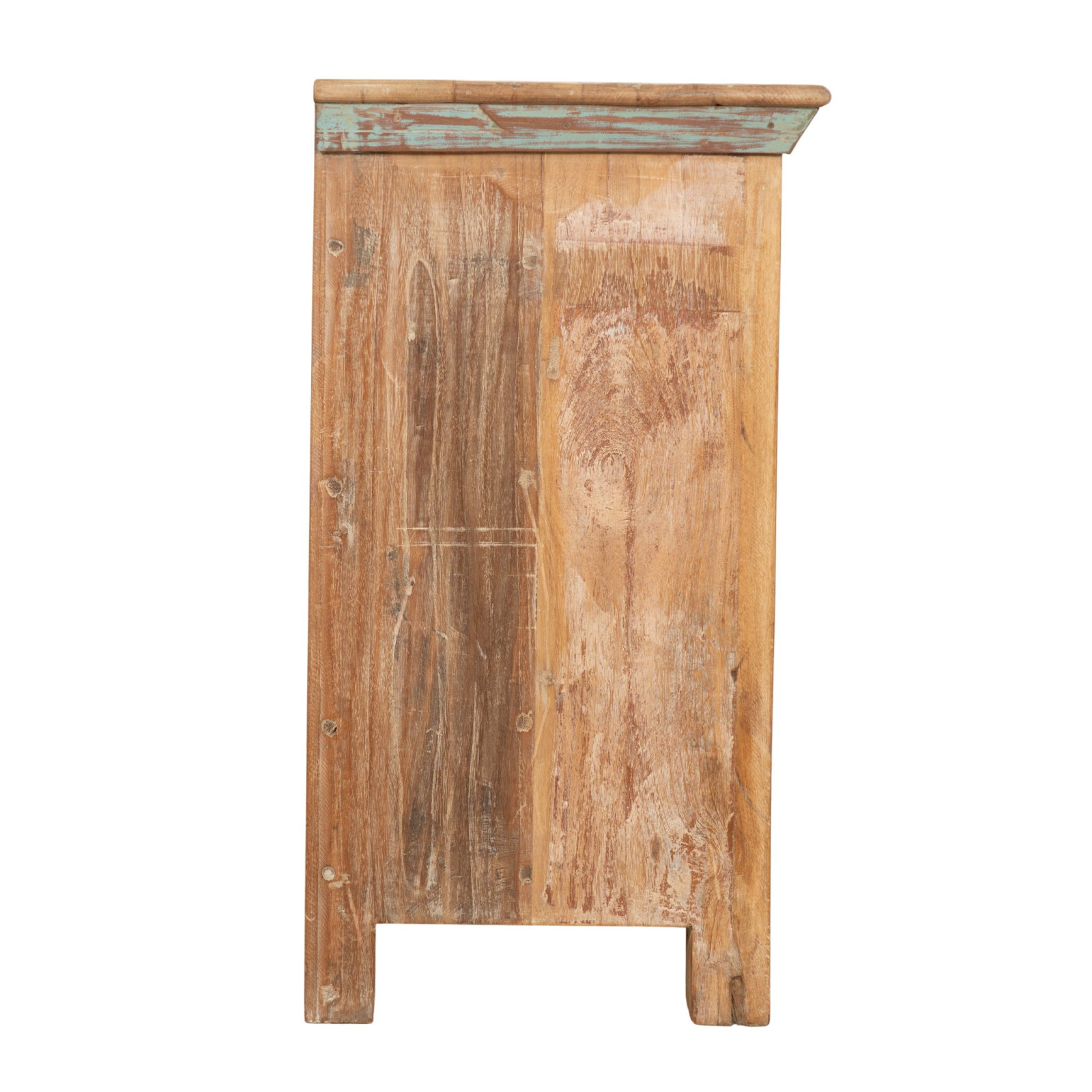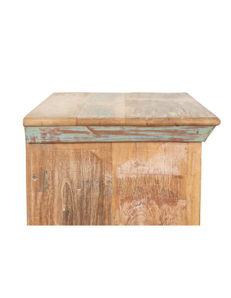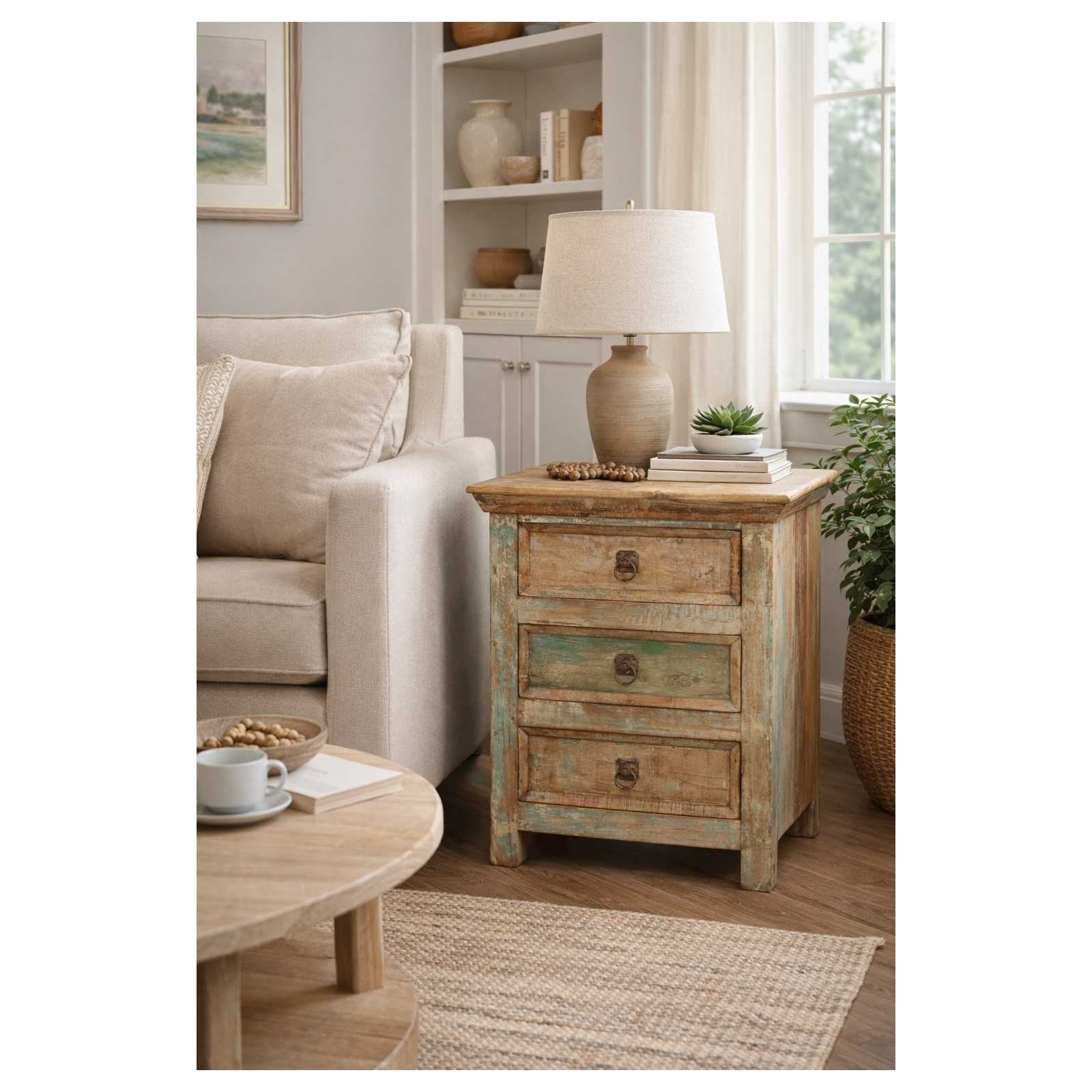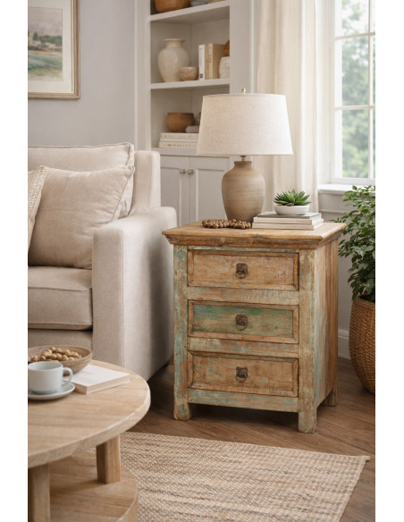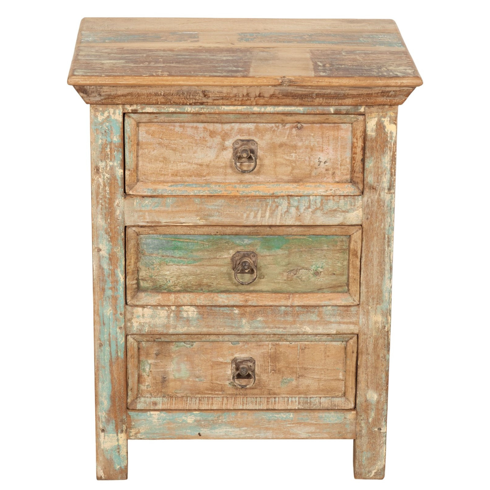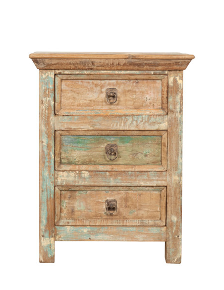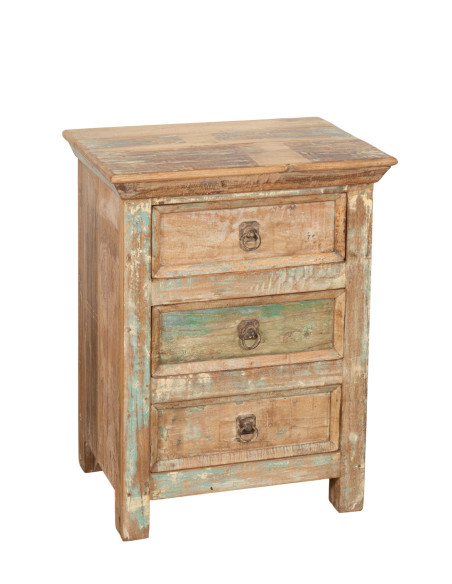 Comodino a 3 cassetti realizzato in legno massello di recupero di dimensioni larghezza 55 cm, profondità 38 cm, altezza 71 cm. Dipinto a mano con vernici naturali, le molteplici sfumature rendono ogni mobile un pezzo unico. Solido e funzionale, è Ideale per gli amanti del mobile antico e del legno.
