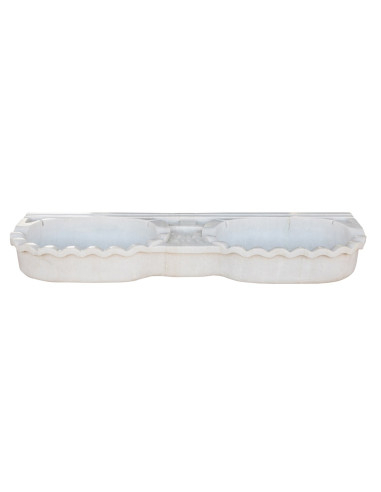 Vasca a due buche in marmo realizzata completamente a mano di dimensioni L30XPR15XH41 cm, già dotata di foro per lo scarico. Ricavata dalla lavorazione di un unico blocco di marmo, le caratteristiche sfumature e venature del materiale la rendono un pezzo unico. Ideale come lavandino da interni o lavello da esterno ma utilizzabile anche come vasca per fontane.
