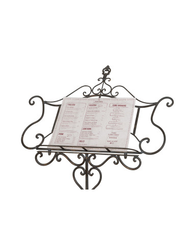 Pratico e molto stabile leggio da terra L85xPR46xH140 cm realizzato in ferro battuto pieno. Regolabile in altezza da un minimo di 132 cm ad un massimo di 162 cm, rappresenta un complemento di arredo versatile ed elegante. Molto indicato anche come porta menù per ristoranti trattorie.