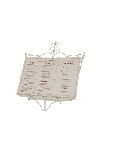 Pratico e molto stabile leggio da terra L46xPR32xH139 cm realizzato in ferro battuto pieno. Regolabile in altezza da un minimo di 120 cm ad un massimo di 165 cm (misure riferite al massimo ingombro dell'articolo), rappresenta un complemento di arredo versatile ed elegante. Molto indicato anche come porta menù per ristoranti trattorie.