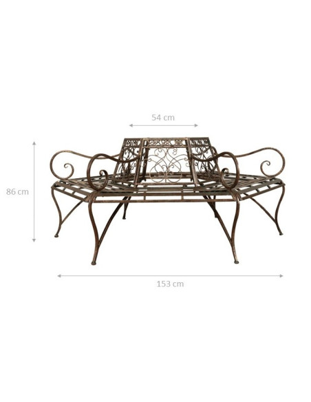 Solida e robusta panchina ad albero diametro 153 cm, altezza 86 cm realizzata in ferro battuto. Il diametro interno è di 54 cm. Dispone inoltre di 6 sedute con braccioli e rappresenta un originale funzionale complemento di arredo per gli spazi aperti.
