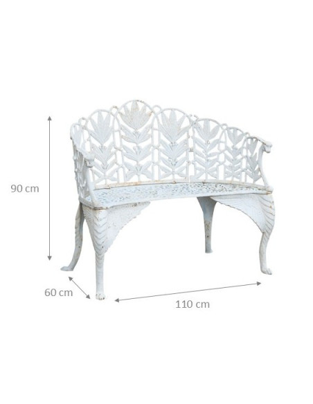 Robusta e stabile panchina realizzata in fusione di ghisa finitura bianca anticata dimensioni larghezza 110 cm, profondità 60 cm, altezza 90 cm. Fedele riproduzione d'epoca. Trattandosi di finiture artigianali, la finitura potrebbe non corrispondere fedelmente alle fotografie, presentando anche parti in ruggine naturale tali da rendere ogni articolo un pezzo unico. Arreda con eleganza qualsiasi ambiente esterno.