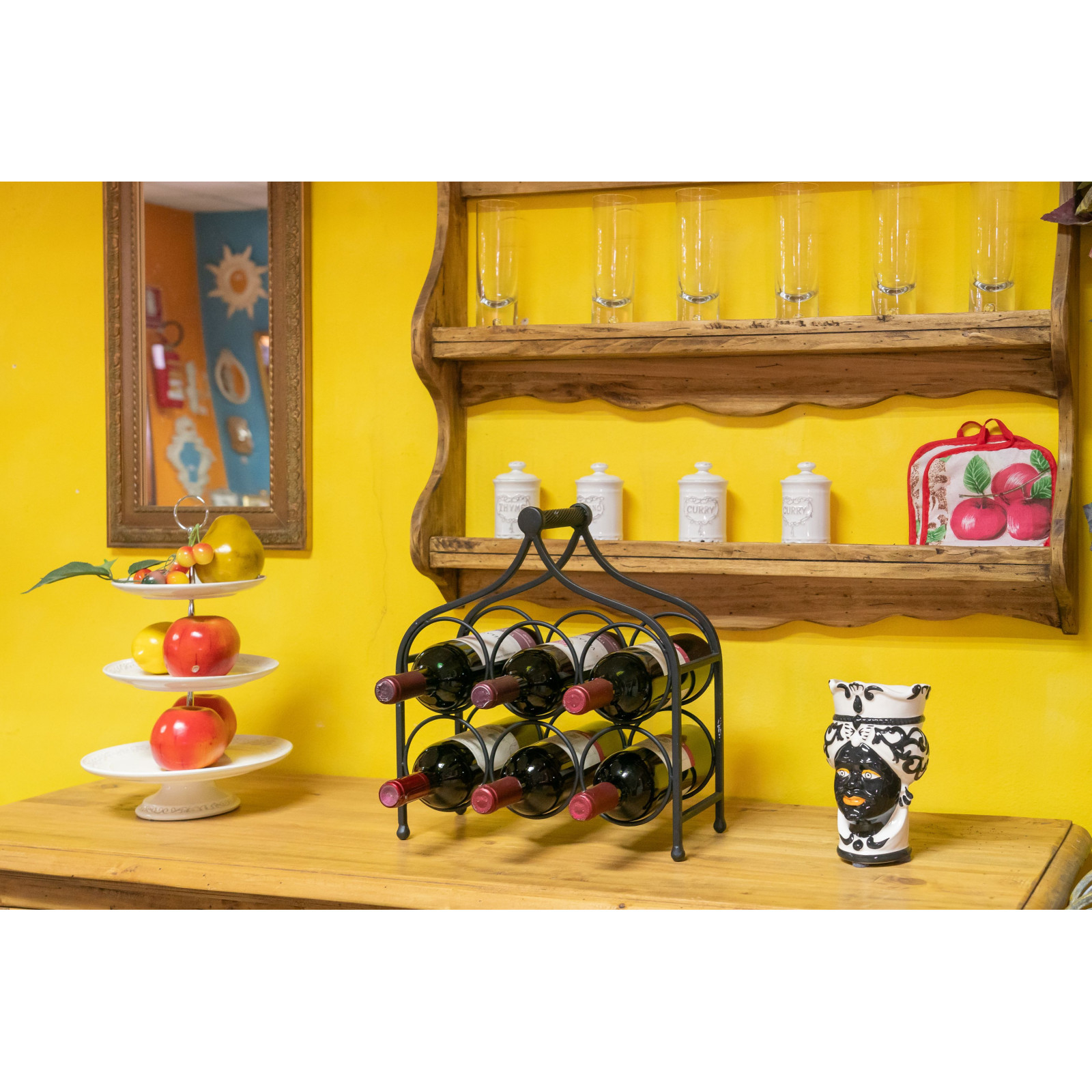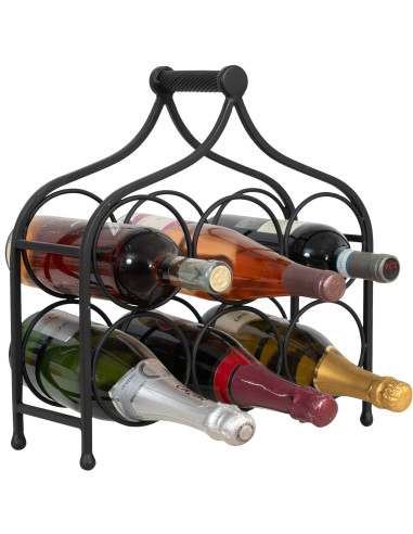Cantinetta portabottiglie di dimensioni larghezza 35 cm, profondità 14 cm, altezza 37 cm realizzata in ferro battuto pieno. Con una capienza di 6 bottiglie, la cantinetta rappresenta un funzionale e pratico complemento d'arredo per ogni ambiente.