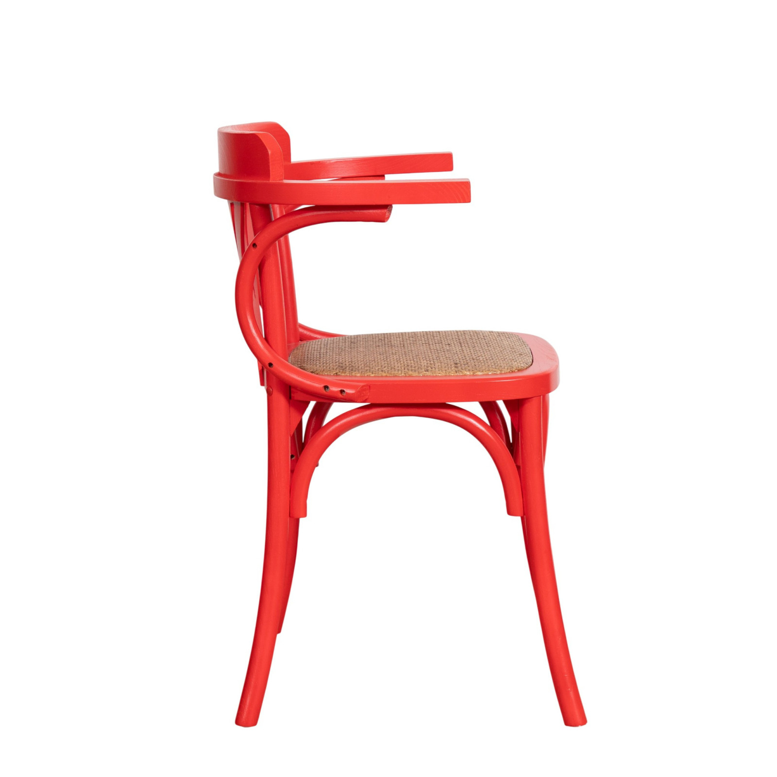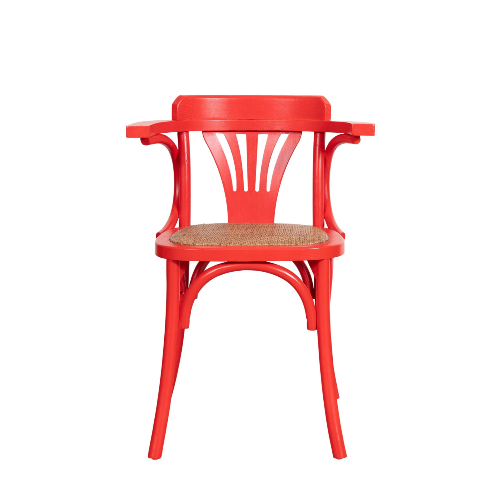 Sedia con braccioli Thonet in massello di frassino finitura rossa e seduta in rattan