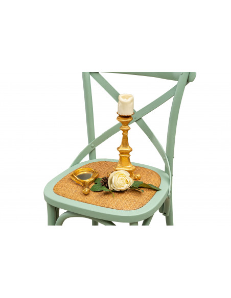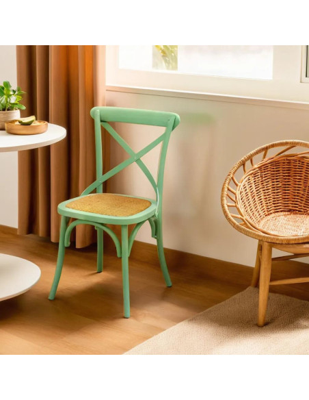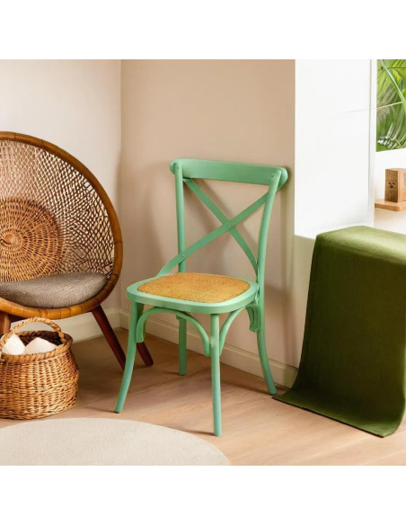 Sedia larghezza 48 cm, profondità 52 cm, altezza 88 cm in stile Thonet realizzata in massello di frassino con schienale incrociato e seduta in fibra di rattan intrecciata. Grazie al loro design da bistrot è ideale per arredare in stile vintage qualsiasi ambiente o locale, senza rinunciare alla comodità.