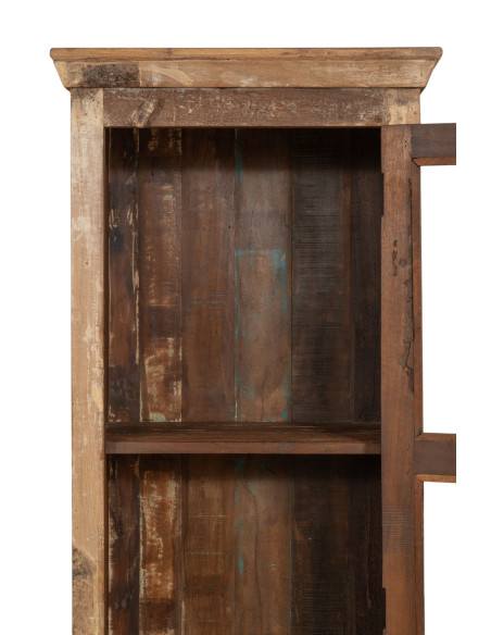 Vitrinekast gemaakt van gerecycled massief hout met een breedte van 63 cm, een diepte van 42 cm en een hoogte van 180 cm. Met de hand beschilderd met natuurlijke verven, waardoor de vele nuances het meubelstuk uniek maken. Stevig en functioneel, ideaal voor liefhebbers van antieke meubels en hout.