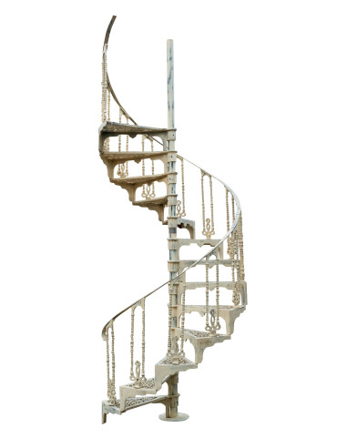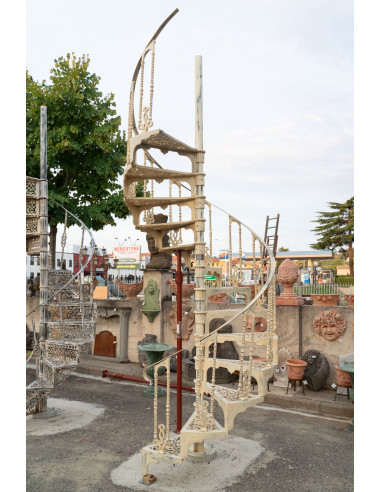 Zeer stabiele, robuuste en zware wenteltrap in gietijzer met afmetingen totale breedte 166 cm, breedte van de trede 92 cm, totale diepte 100 cm, hoogte van de laatste trede 295 cm, totale hoogte 375 cm, met een nauwkeurige afwerking volledig handgemaakt, het verkrijgen van een echt antiek effect. Omdat dit handgemaakte afwerkingen zijn, komt de afwerking mogelijk niet getrouw overeen met de foto's, omdat er ook natuurlijke roestdelen aanwezig zijn die elk item tot een uniek stuk maken.