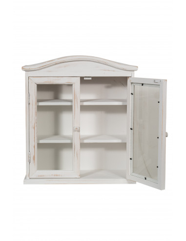 Houten vitrinekast met antieke witte afwerking, afmetingen 42 cm lang, 15 cm diep, 48 cm hoog, sjofele stijl. Alle metingen hebben betrekking op de maximale totale afmetingen van het artikel.