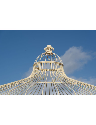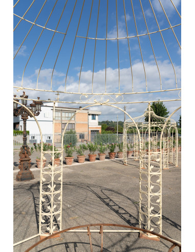 Zeer stevig en stabiel tuinhuisje gemaakt van stevige ijzeren buizen met afmetingen 400 cm breed, 400 cm diep, 390 cm hoog, antiek afgewerkt met gekraste en opzettelijk geschilderde delen voor een doorleefde look. Dit tuinhuisje heeft geen gemeentelijke vergunning nodig om geplaatst te worden. Alle afmetingen hebben betrekking op de maximale totale afmetingen van het artikel.