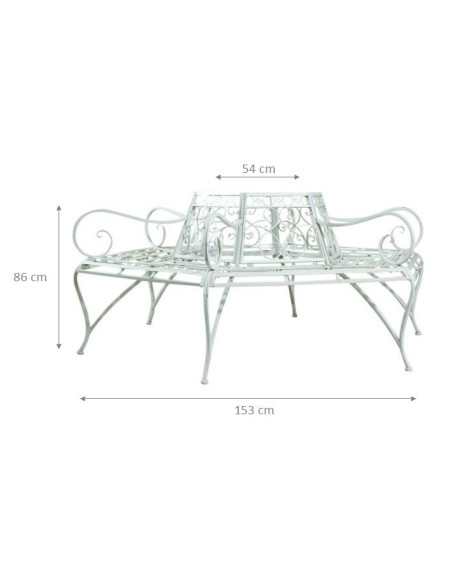 Solide en stevige boomvormige bank, maat 153 cm, diepte 153 cm, hoogte 86 cm gemaakt van smeedijzer. De binnendiameter is 54 cm. Het heeft ook 6 stoelen met armleuningen en vertegenwoordigt een origineel functioneel meubelaccessoire voor open ruimtes