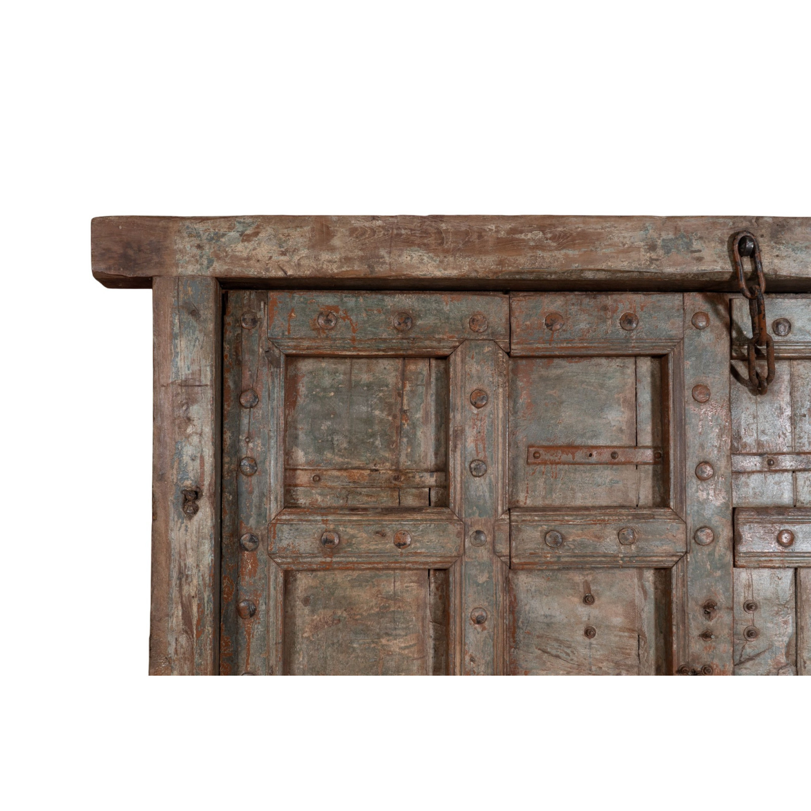 Antieke deur/poort van massief teakhout met een lengte van 202 cm, een diepte van 23 cm en een hoogte van 229 cm. Deze deur is afkomstig uit sloopwerkzaamheden en restauraties van oude en belangrijke gebouwen. Elke deur is zorgvuldig gerestaureerd en behandeld voor gebruik buitenshuis en is een echt en uniek antiek stuk. Alle afmetingen hebben betrekking op de maximale afmetingen van het artikel.