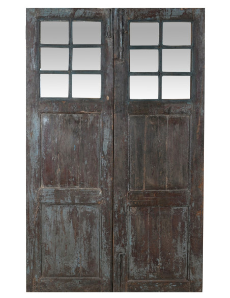 Oude, antieke middeleeuwse deur van massief hout en ijzer voor binnen- of buitengebruik met glas
